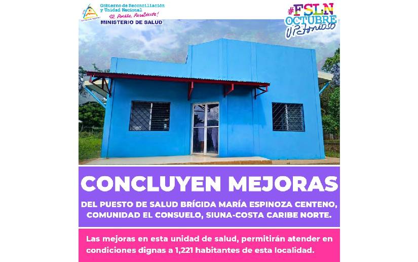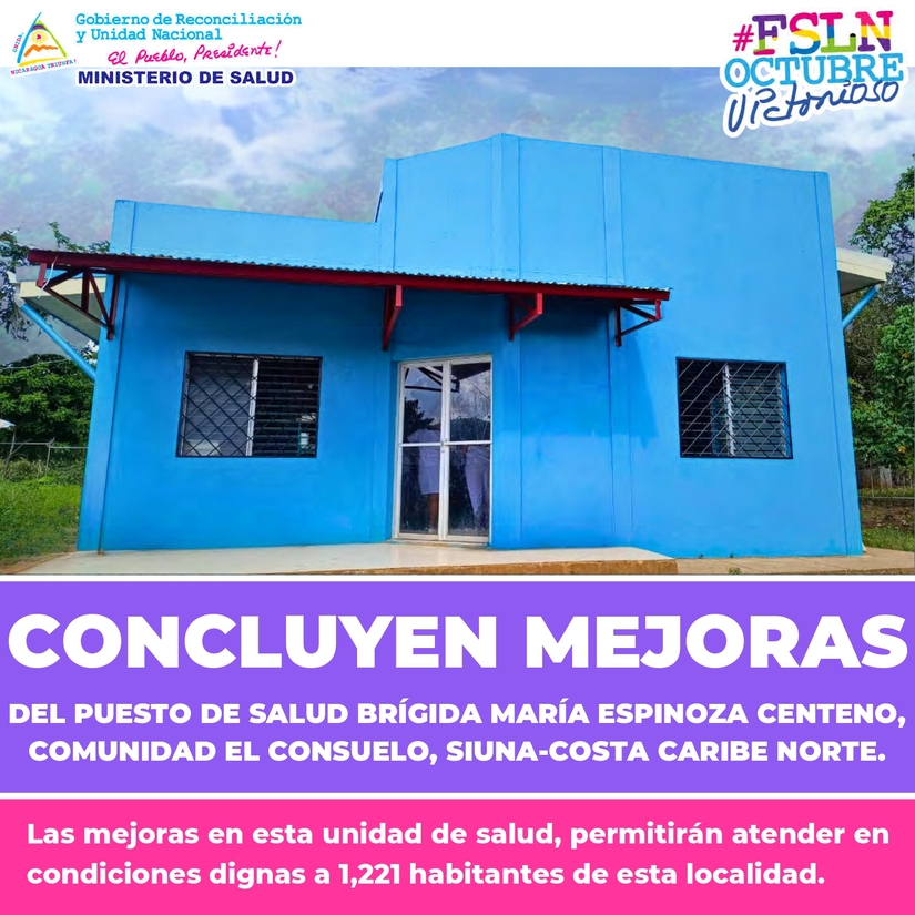 Hoy Viernes 27 de Octubre inauguramos las mejoras del Puesto de Salud Brígida María Espinoza Centeno, en la Comunidad El Consuelo, Siuna, Costa Caribe Norte, para atender en mejores condiciones a 1,221 personas de esta localidad (Inversión : 126 mil córdobas).