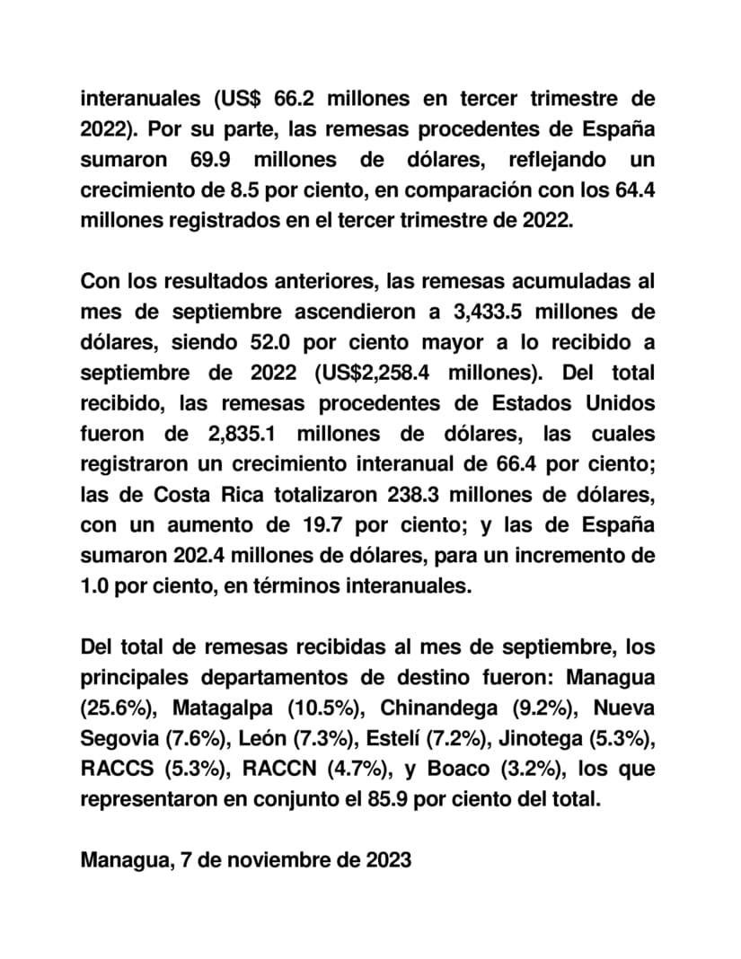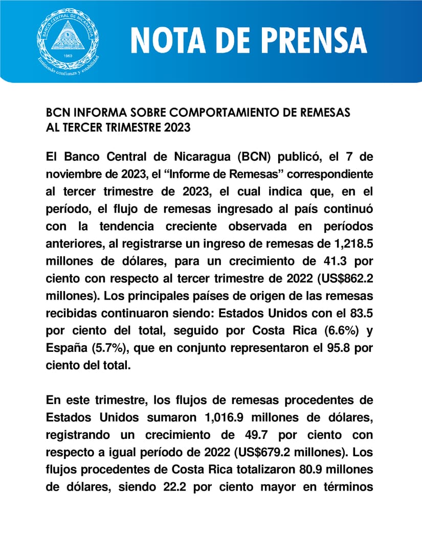 El Banco Central de Nicaragua (BCN) publicó, el 7 de noviembre de 2023, el “Informe de Remesas” correspondiente al tercer trimestre de 2023, el cual indica que, en el período, el flujo de remesas ingresado al país continuó con la tendencia creciente observada en períodos anteriores, al registrarse un ingreso de remesas de 1,218.5 millones de dólares, para un crecimiento de 41.3 por ciento con respecto al tercer trimestre de 2022 (US$862.2 millones). Los principales países de origen de las remesas recibidas continuaron siendo: Estados Unidos con el 83.5 por ciento del total, seguido por Costa Rica (6.6%) y España (5.7%), que en conjunto representaron el 95.8 por ciento del total.