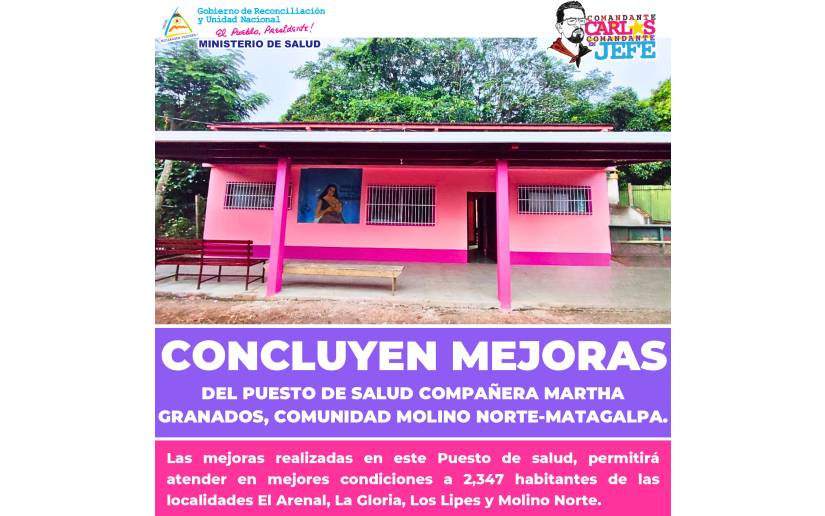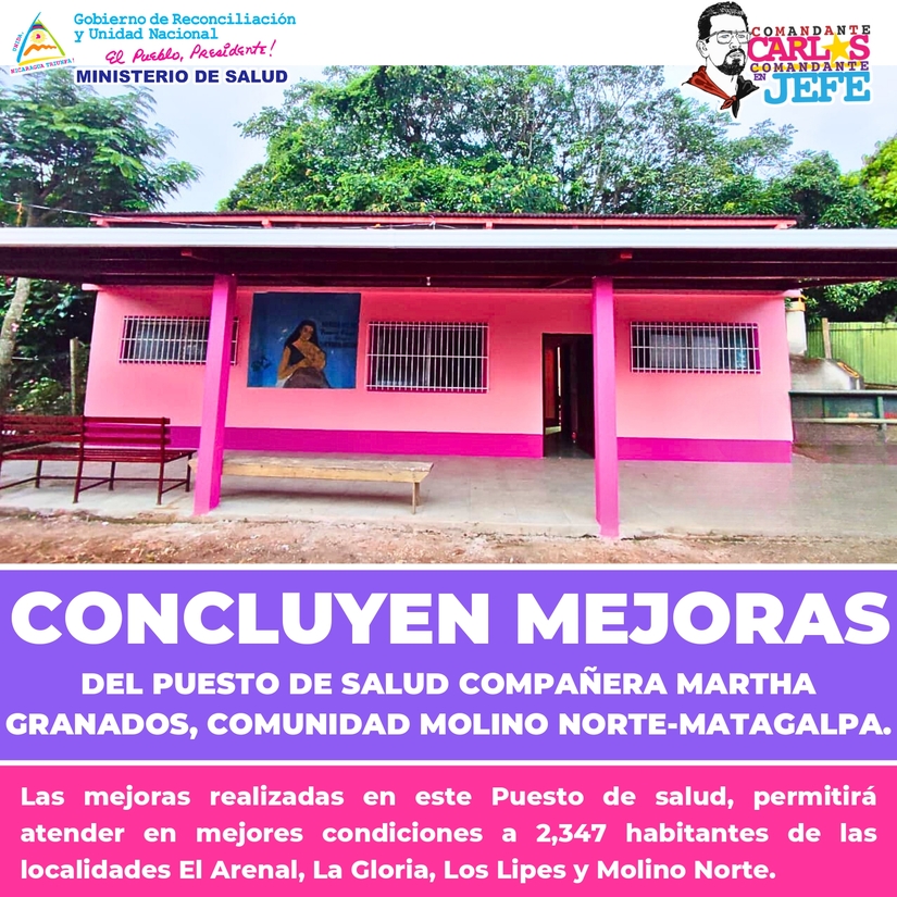 Hoy Miércoles 15 de Noviembre inauguramos las mejoras del Puesto de Salud Compañera Martha Granados, Comunidad Molino Norte, Matagalpa, para atender en mejores condiciones a 2,347 habitantes de las Comunidades El Arenal, La Gloria, Los Lipes y Molino Norte (Inversión: 343 mil córdobas).