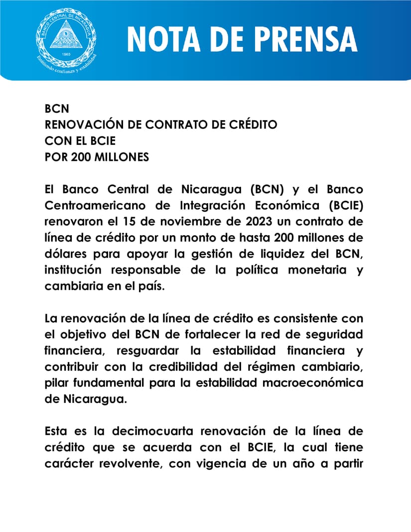 El Banco Central de Nicaragua (BCN) y el Banco Centroamericano de Integración Económica (BCIE) renovaron el 15 de noviembre de 2023 un contrato de línea de crédito por un monto de hasta 200 millones de dólares para apoyar la gestión de liquidez del BCN, institución responsable de la política monetaria y cambiaria en el país.