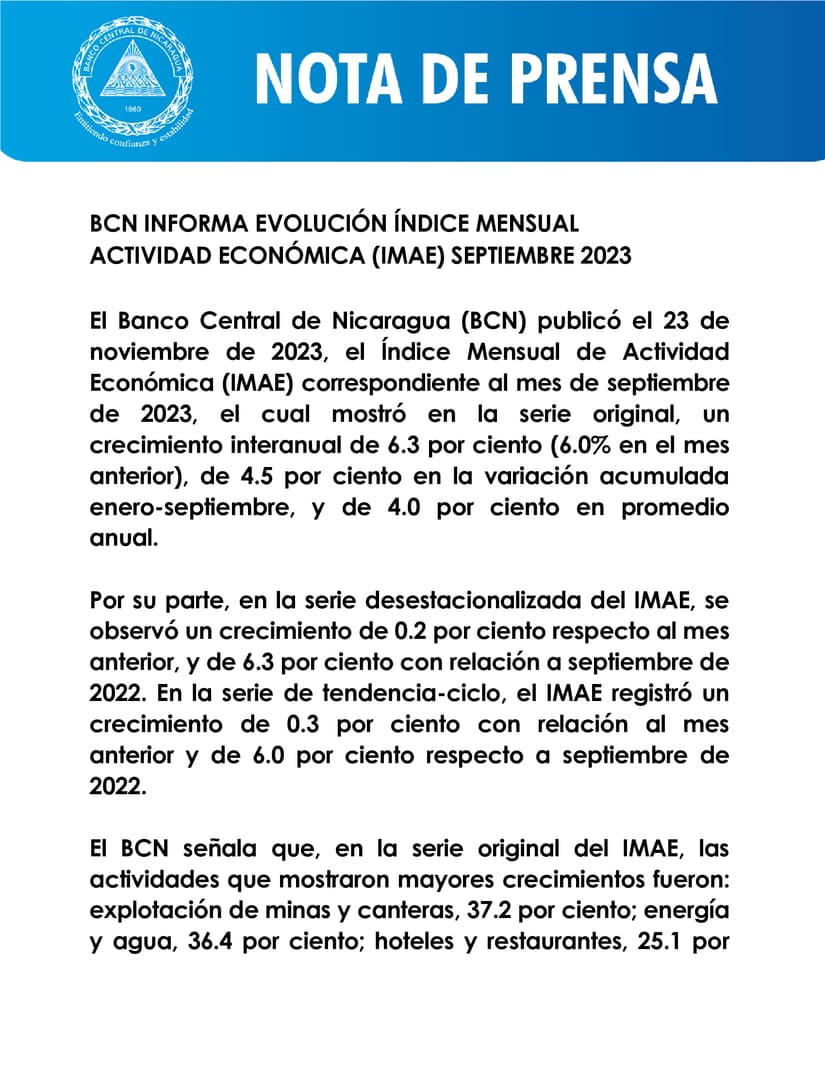 El Banco Central de Nicaragua (BCN) publicó el 23 de noviembre de 2023, el Índice Mensual de Actividad Económica (IMAE) correspondiente al mes de septiembre de 2023, el cual mostró en la serie original, un crecimiento interanual de 6.3 por ciento (6.0% en el mes anterior), de 4.5 por ciento en la variación acumulada enero-septiembre, y de 4.0 por ciento en promedio anual.