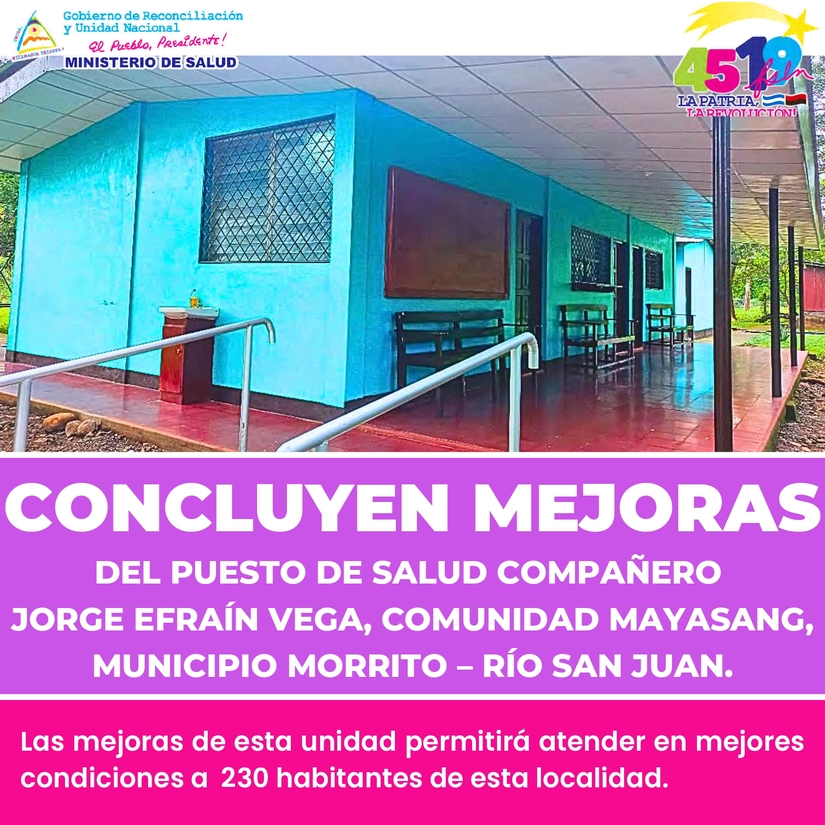 Mañana Miércoles, entregamos mejoras del Puesto de Salud “Compañero Jorge Efraín Vega”, en la Comunidad Mayasang, del Municipio de Morrito en Río San Juan, para atender en mejores condiciones a 230 habitantes de esta localidad (Inversión 650 mil córdobas).