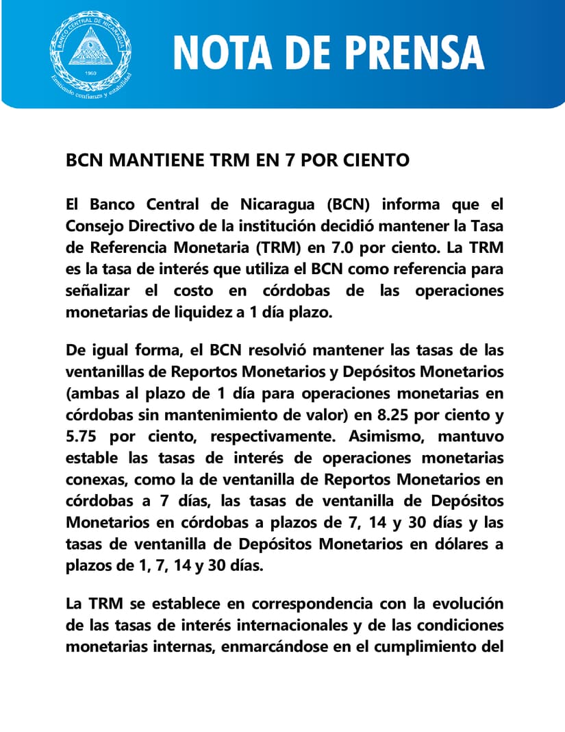 El Banco Central de Nicaragua (BCN) informa que el Consejo Directivo de la institución decidió mantener la Tasa de Referencia Monetaria (TRM) en 7.0 por ciento. La TRM es la tasa de interés que utiliza el BCN como referencia para señalizar el costo en córdobas de las operaciones monetarias de liquidez a 1 día plazo.