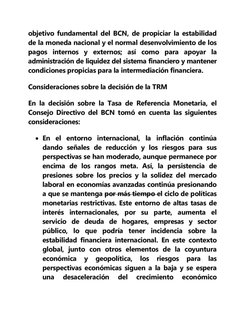 En la decisión sobre la Tasa de Referencia Monetaria, el Consejo Directivo del BCN tomó en cuenta las siguientes consideraciones: