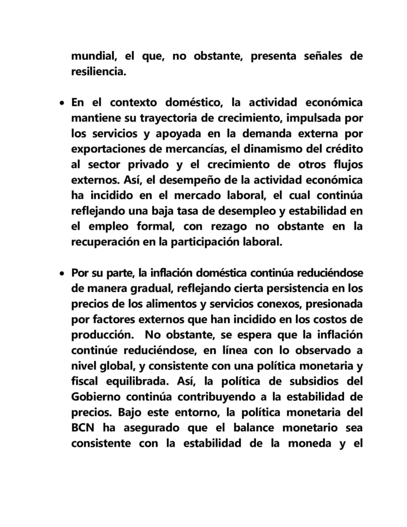 • Por su parte, la inflación doméstica continúa reduciéndose de manera gradual, reflejando cierta persistencia en los precios de los alimentos y servicios conexos, presionada por factores externos que han incidido en los costos de producción. No obstante, se espera que la inflación continúe reduciéndose, en línea con lo observado a nivel global, y consistente con una política monetaria y fiscal equilibrada. Así, la política de subsidios del Gobierno continúa contribuyendo a la estabilidad de precios. Bajo este entorno, la política monetaria del BCN ha asegurado que el balance monetario sea consistente con la estabilidad de la moneda y el respaldo del tipo de cambio, aumentándose el nivel de reservas internacionales.