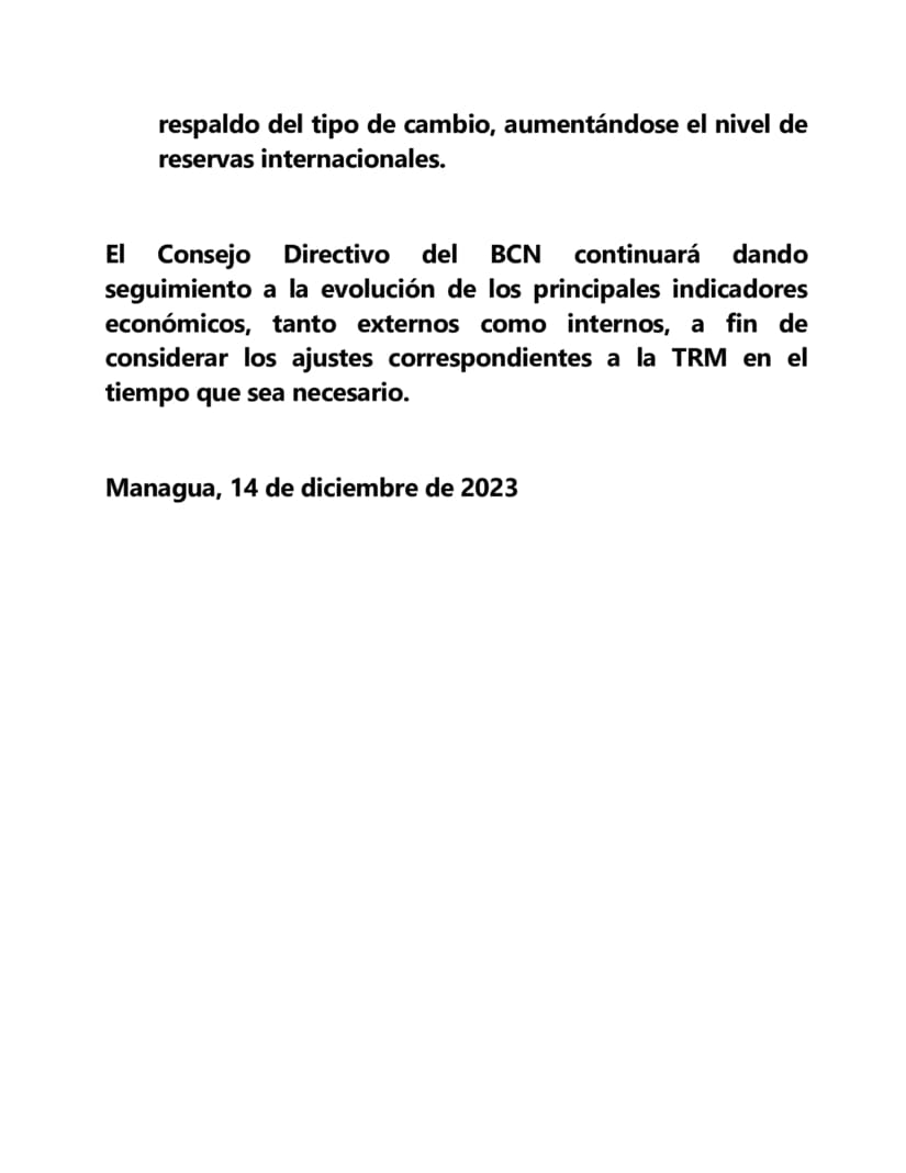 El Consejo Directivo del BCN continuará dando seguimiento a la evolución de los principales indicadores económicos, tanto externos como internos, a fin de considerar los ajustes correspondientes a la TRM en el tiempo que sea necesario.