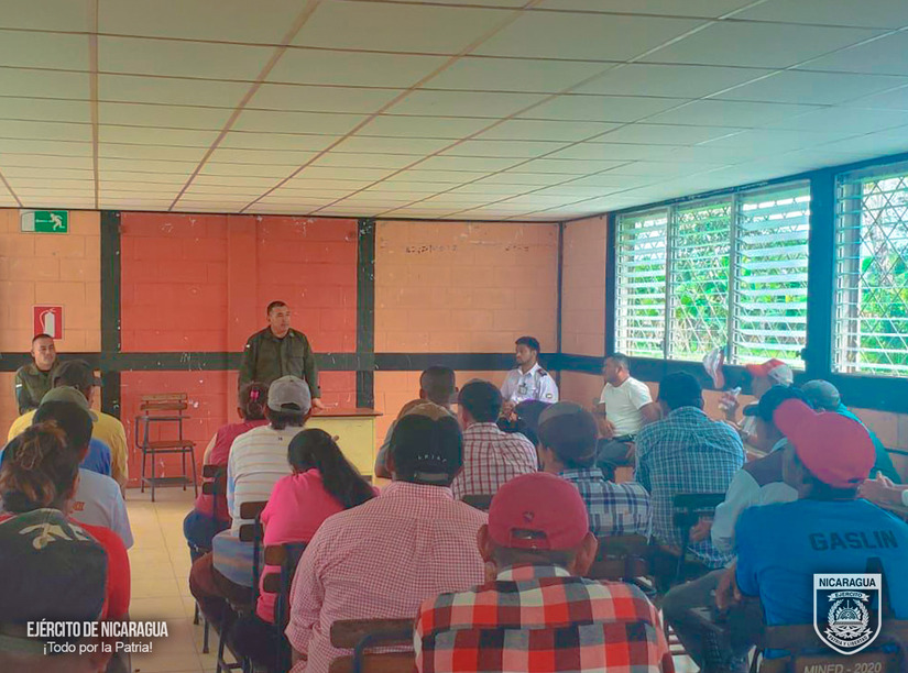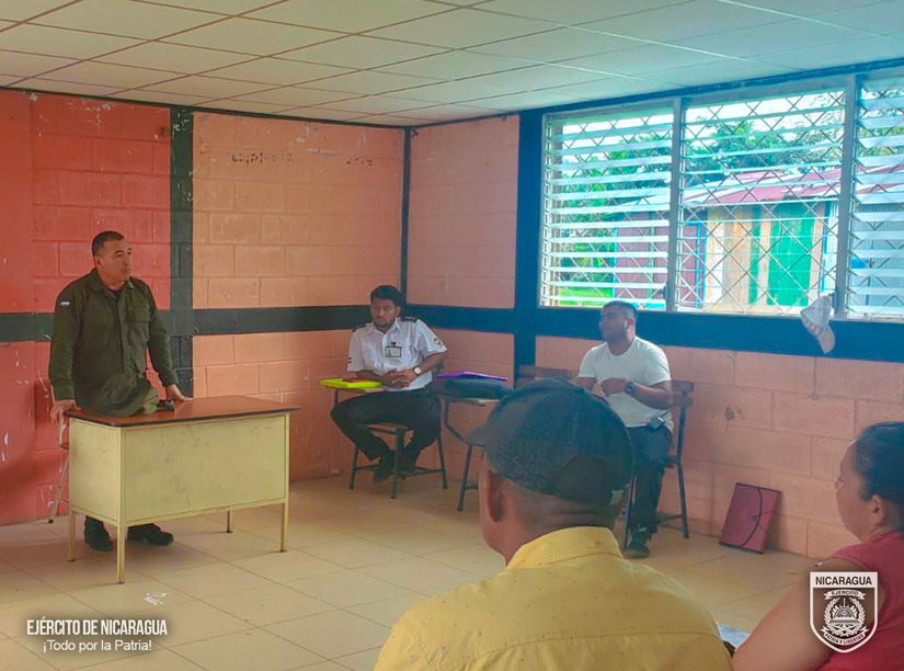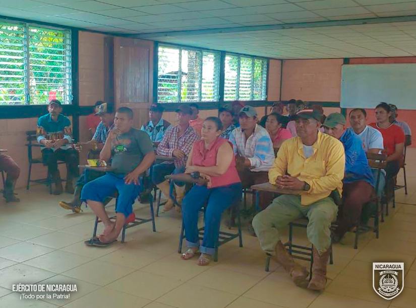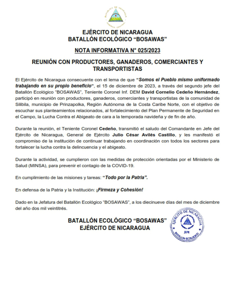 El Ejército de Nicaragua consecuente con el lema de que “Somos el Pueblo mismo uniformado trabajando en su propio beneficio”, el 15 de diciembre de 2023, a través del segundo jefe del Batallón Ecológico “BOSAWAS”, Teniente Coronel Inf. DEM David Cornelio Cedeño Hernández, participó en reunión con productores, ganaderos, comerciantes y transportistas de la comunidad de Silibila, municipio de Prinzapolka, Región Autónoma de la Costa Caribe Norte, con el objetivo de escuchar sus planteamientos relacionados, al fortalecimiento del Plan Permanente de Seguridad en el Campo, la Lucha Contra el Abigeato de cara a la temporada navideña y de fin de año.