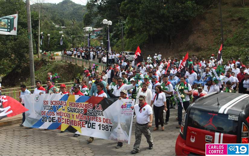 A primeras horas del día, en Bonanza, la militancia sandinista y las familias locales participaron en una caminata por las calles de la ciudad, para posteriormente rendir tributo con ofrendas florales en el cementerio local.