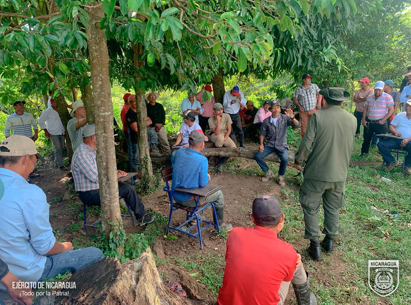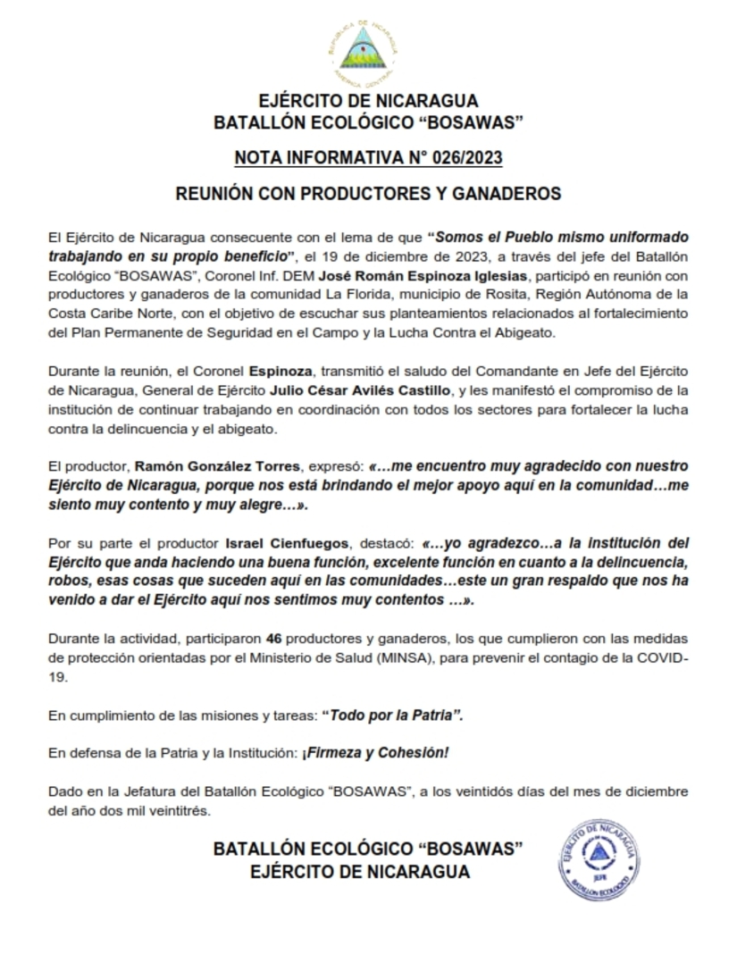 El Ejército de Nicaragua consecuente con el lema de que “Somos el Pueblo mismo uniformado trabajando en su propio beneficio”, el 19 de diciembre de 2023, a través del jefe del Batallón Ecológico “BOSAWAS”, Coronel Inf. DEM José Román Espinoza Iglesias, participó en reunión con productores y ganaderos de la comunidad La Florida, municipio de Rosita, Región Autónoma de la Costa Caribe Norte, con el objetivo de escuchar sus planteamientos relacionados al fortalecimiento del Plan Permanente de Seguridad en el Campo y la Lucha Contra el Abigeato.