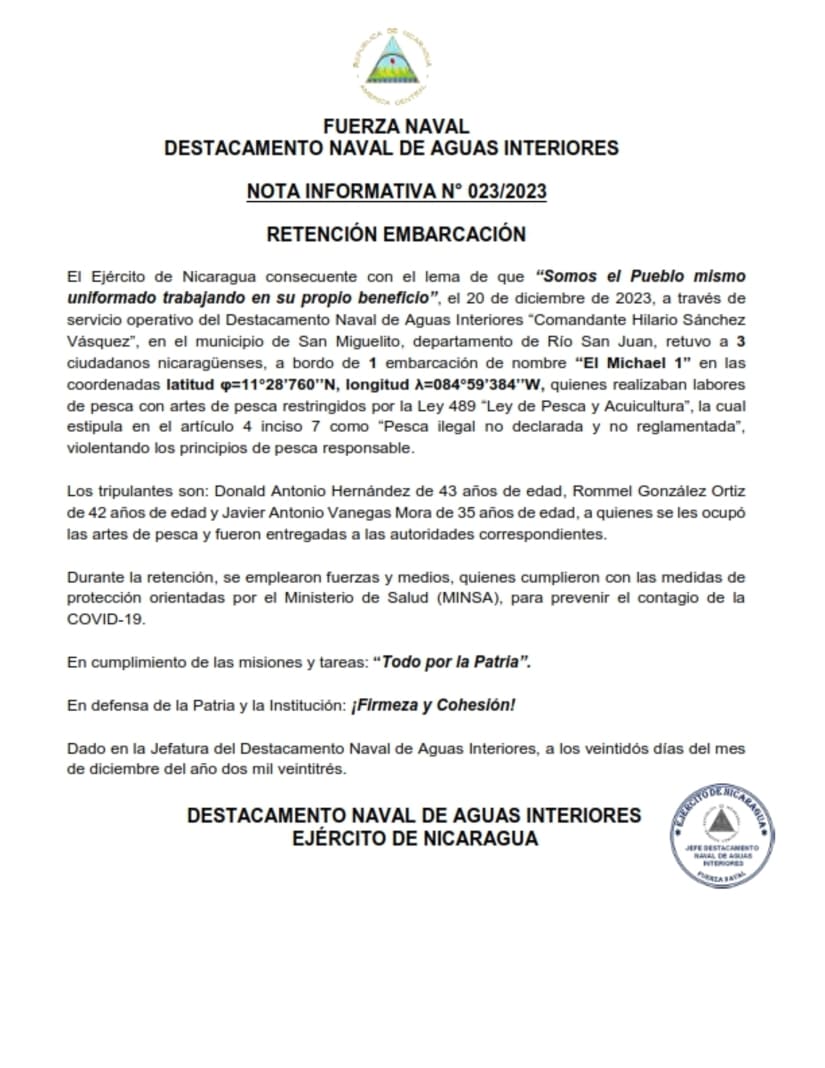 El Ejército de Nicaragua consecuente con el lema de que “Somos el Pueblo mismo uniformado trabajando en su propio beneficio”, el 20 de diciembre de 2023, a través de servicio operativo del Destacamento Naval de Aguas Interiores “Comandante Hilario Sánchez Vásquez”, en el municipio de San Miguelito, departamento de Río San Juan, retuvo a 3 ciudadanos nicaragüenses, a bordo de 1 embarcación de nombre “El Michael 1” en las coordenadas latitud φ=11°28’760’’N, longitud λ=084°59’384’’W, quienes realizaban labores de pesca con artes de pesca restringidos por la Ley 489 “Ley de Pesca y Acuicultura”, la cual estipula en el artículo 4 inciso 7 como “Pesca ilegal no declarada y no reglamentada”, violentando los principios de pesca responsable.