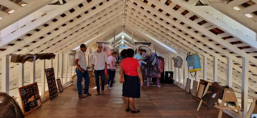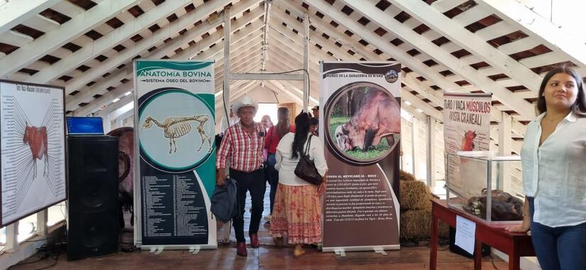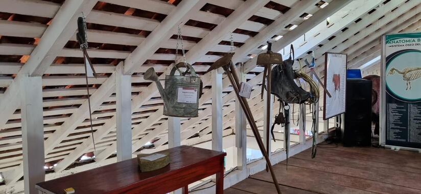 Planta baja: esqueletos de bovino y equino, sala con trampas para ordeño, comederos, bebederos y láminas con imágenes que reflejan la historia de la ganadería. Se destacan instrumentos como mesa de cirugía, trampa de campo, carretas de madera, corrales tradicionales, maquinarias e implementos importantes para la producción bovina.