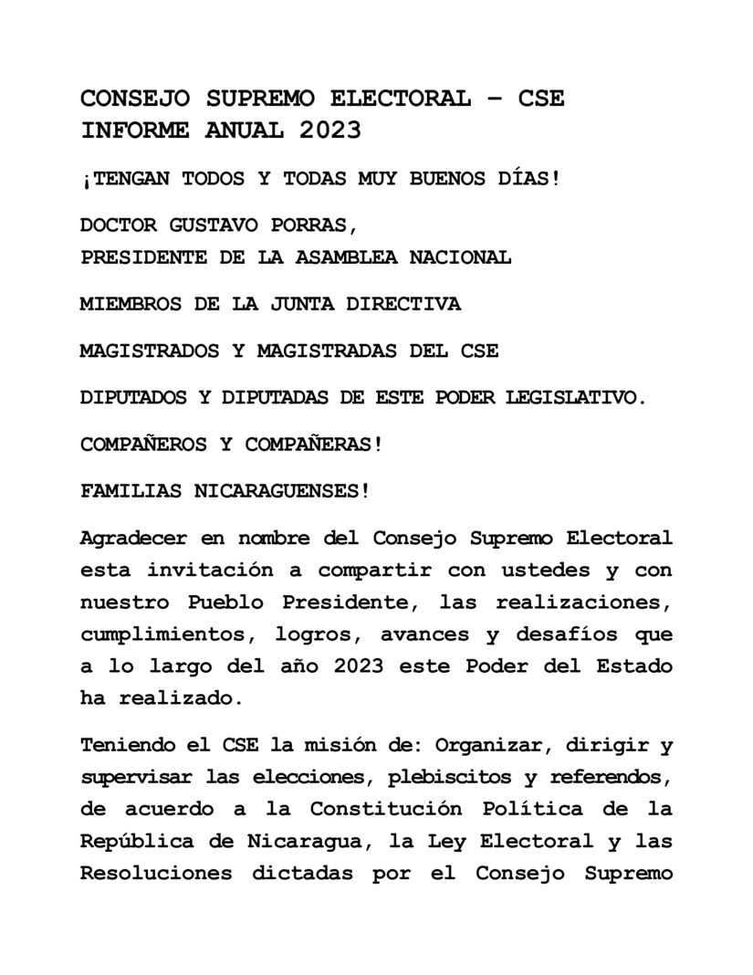 Agradecer en nombre del Consejo Supremo Electoral esta invitación a compartir con ustedes y con nuestro Pueblo Presidente, las realizaciones, cumplimientos, logros, avances y desafíos que a lo largo del año 2023 este Poder del Estado ha realizado.