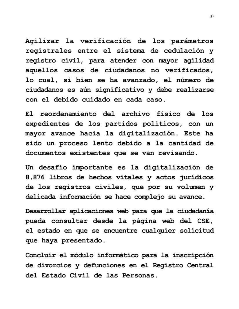 Un desafío importante es la digitalización de 8,876 libros de hechos vitales y actos jurídicos de los registros civiles, que por su volumen y delicada información se hace complejo su avance.