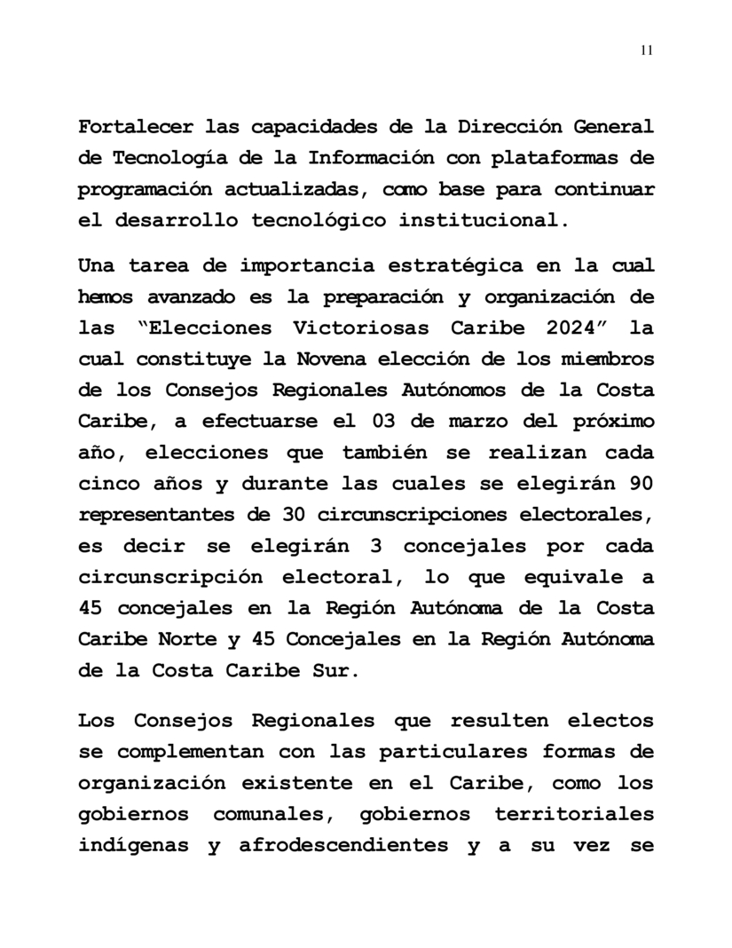 Una tarea de importancia estratégica en la cual hemos avanzado es la preparación y organización de las “Elecciones Victoriosas Caribe 2024” la cual constituye la Novena elección de los miembros de los Consejos Regionales Autónomos de la Costa Caribe, a efectuarse el 03 de marzo del próximo año, elecciones que también se realizan cada cinco años y durante las cuales se elegirán 90 representantes de 30 circunscripciones electorales, es decir se elegirán 3 concejales por cada circunscripción electoral, lo que equivale a 45 concejales en la Región Autónoma de la Costa Caribe Norte y 45 Concejales en la Región Autónoma de la Costa Caribe Sur.