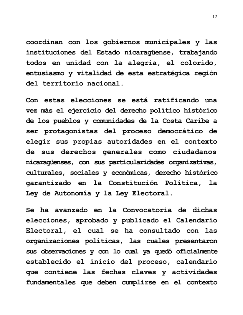Con estas elecciones se está ratificando una vez más el ejercicio del derecho político histórico de los pueblos y comunidades de la Costa Caribe a ser protagonistas del proceso democrático de elegir sus propias autoridades en el contexto de sus derechos generales como ciudadanos nicaragüenses, con sus particularidades organizativas, culturales, sociales y económicas, derecho histórico garantizado en la Constitución Política, la Ley de Autonomía y la Ley Electoral.