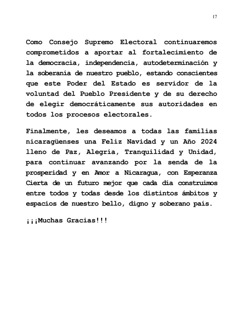 Finalmente, les deseamos a todas las familias nicaragüenses una Feliz Navidad y un Año 2024 lleno de Paz, Alegría, Tranquilidad y Unidad, para continuar avanzando por la senda de la prosperidad y en Amor a Nicaragua, con Esperanza Cierta de un futuro mejor que cada día construimos entre todos y todas desde los distintos ámbitos y espacios de nuestro bello, digno y soberano país.