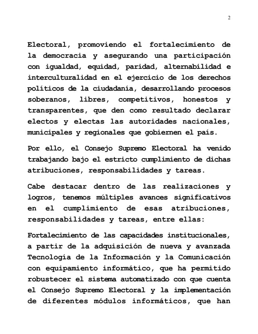 Fortalecimiento de las capacidades institucionales, a partir de la adquisición de nueva y avanzada Tecnología de la Información y la Comunicación con equipamiento informático, que ha permitido robustecer el sistema automatizado con que cuenta el Consejo Supremo Electoral y la implementación de diferentes módulos informáticos, que han generado un mayor nivel de confiabilidad y seguridad en todos los procesos, así como el debido resguardo de la información de la ciudadanía y, sobre todo la atención ágil y oportuna a la población, con mayor eficiencia y calidad en el sistema de identificación ciudadana para la emisión de los documentos de identidad.