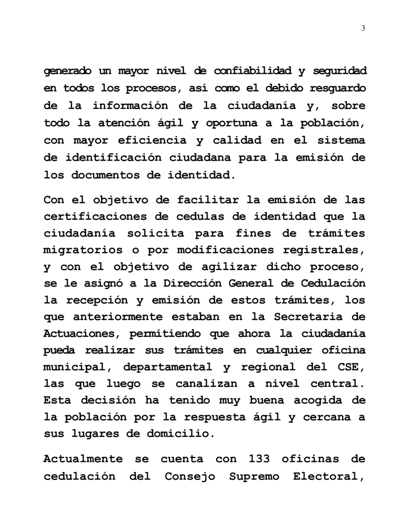 Con el objetivo de facilitar la emisión de las certificaciones de cedulas de identidad que la ciudadanía solicita para fines de trámites migratorios o por modificaciones registrales, y con el objetivo de agilizar dicho proceso, se le asignó a la Dirección General de Cedulación la recepción y emisión de estos trámites, los que anteriormente estaban en la Secretaria de Actuaciones, permitiendo que ahora la ciudadanía pueda realizar sus trámites en cualquier oficina municipal, departamental y regional del CSE, las que luego se canalizan a nivel central. Esta decisión ha tenido muy buena acogida de la población por la respuesta ágil y cercana a sus lugares de domicilio.