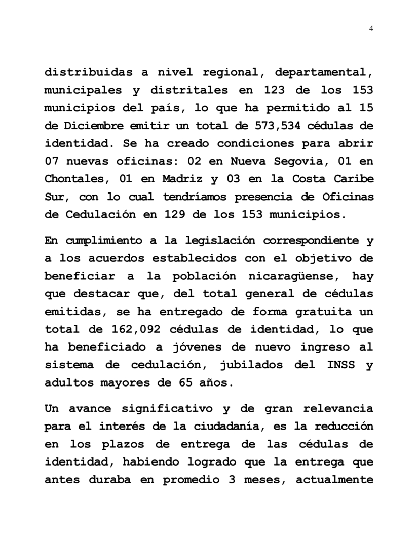 Actualmente se cuenta con 133 oficinas de cedulación del Consejo Supremo Electoral, distribuidas a nivel regional, departamental, municipales y distritales en 123 de los 153 municipios del país, lo que ha permitido al 15 de Diciembre emitir un total de 573,534 cédulas de identidad. Se ha creado condiciones para abrir 07 nuevas oficinas: 02 en Nueva Segovia, 01 en Chontales, 01 en Madriz y 03 en la Costa Caribe Sur, con lo cual tendríamos presencia de Oficinas de Cedulación en 129 de los 153 municipios.