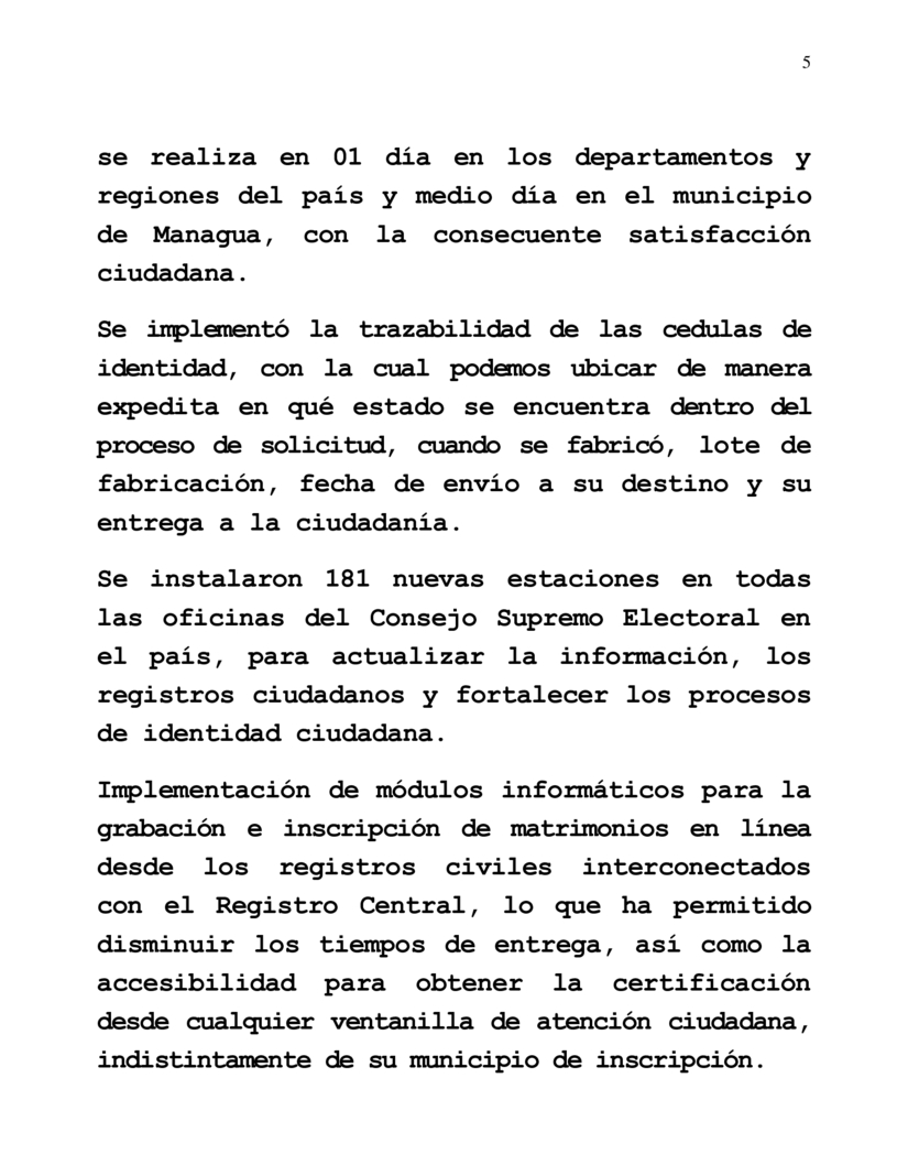 Un avance significativo y de gran relevancia para el interés de la ciudadanía, es la reducción en los plazos de entrega de las cédulas de identidad, habiendo logrado que la entrega que antes duraba en promedio 3 meses, actualmente se realiza en 01 día en los departamentos y regiones del país y medio día en el municipio de Managua, con la consecuente satisfacción ciudadana.