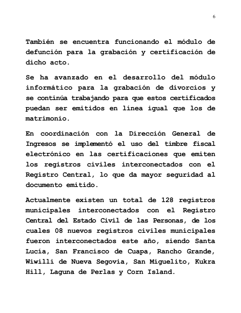 Actualmente existen un total de 128 registros municipales interconectados con el Registro Central del Estado Civil de las Personas, de los cuales 08 nuevos registros civiles municipales fueron interconectados este año, siendo Santa Lucía, San Francisco de Cuapa, Rancho Grande, Wiwilli de Nueva Segovia, San Miguelito, Kukra Hill, Laguna de Perlas y Corn Island.