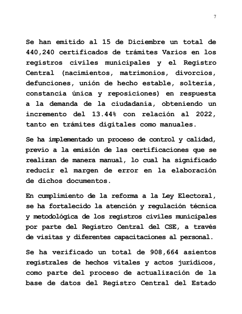 Se han emitido al 15 de Diciembre un total de 440,240 certificados de trámites Varios en los registros civiles municipales y el Registro Central (nacimientos, matrimonios, divorcios, defunciones, unión de hecho estable, soltería, constancia única y reposiciones) en respuesta a la demanda de la ciudadanía, obteniendo un incremento del 13.44% con relación al 2022, tanto en trámites digitales como manuales.
