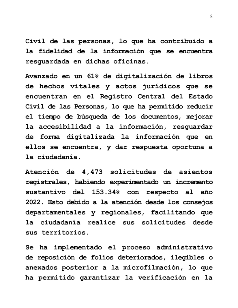 Avanzado en un 61% de digitalización de libros de hechos vitales y actos jurídicos que se encuentran en el Registro Central del Estado Civil de las Personas, lo que ha permitido reducir el tiempo de búsqueda de los documentos, mejorar la accesibilidad a la información, resguardar de forma digitalizada la información que en ellos se encuentra, y dar respuesta oportuna a la ciudadanía.