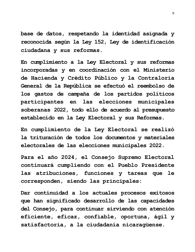 Para el año 2024, el Consejo Supremo Electoral continuará cumpliendo con el Pueblo Presidente las atribuciones, funciones y tareas que le corresponden, siendo las principales: