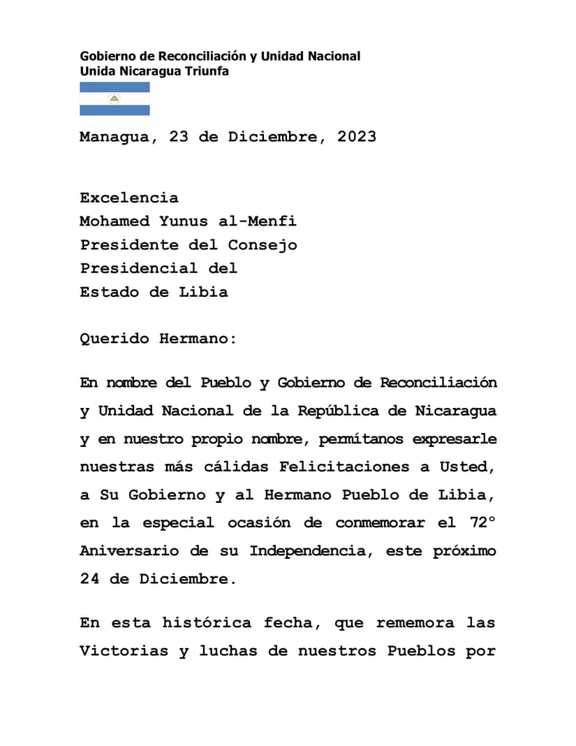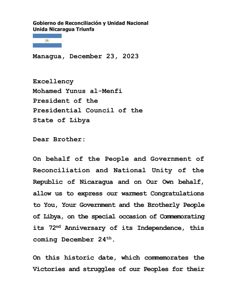 On behalf of the People and Government of Reconciliation and National Unity of the Republic of Nicaragua and on Our Own behalf, allow us to express our warmest Congratulations to You, Your Government and the Brotherly People of Libya, on the special occasion of Commemorating its 72nd Anniversary of its Independence, this coming December 24th.