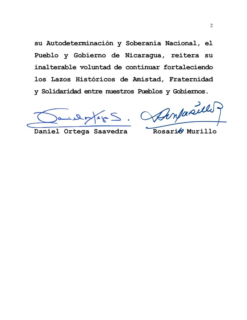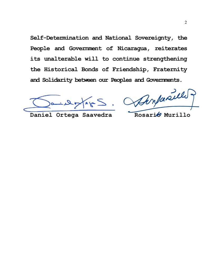 En esta histórica fecha, que rememora las Victorias y luchas de nuestros Pueblos por su Autodeterminación y Soberanía Nacional, el Pueblo y Gobierno de Nicaragua, reitera su inalterable voluntad de continuar fortaleciendo los Lazos Históricos de Amistad, Fraternidad y Solidaridad entre nuestros Pueblos y Gobiernos.