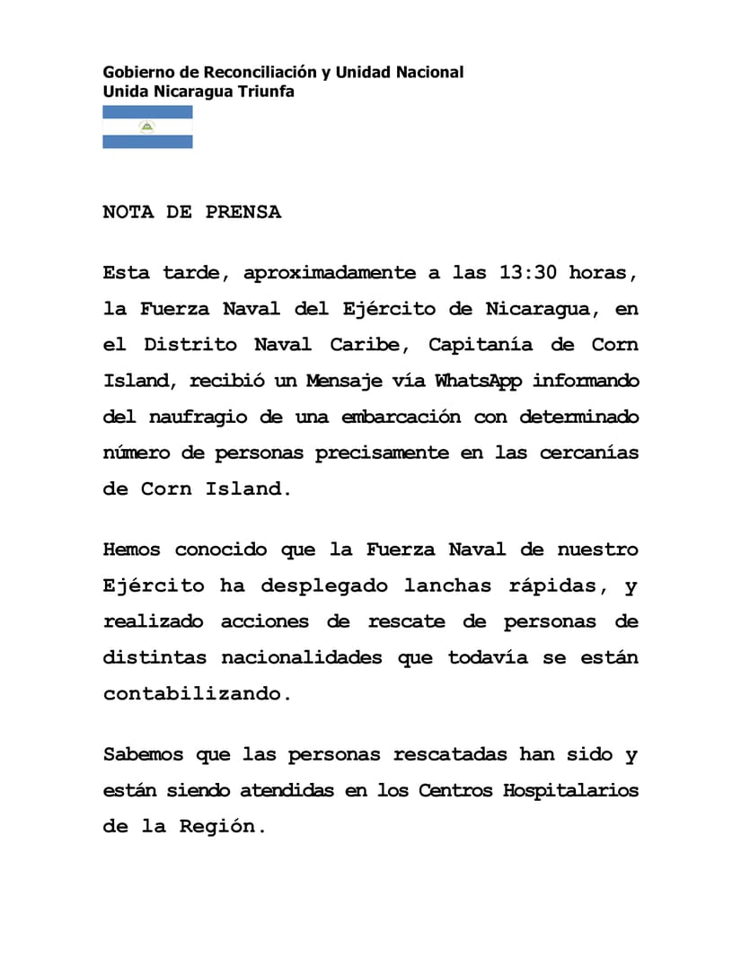Esta tarde, aproximadamente a las 13:30 horas, la Fuerza Naval del Ejército de Nicaragua, en el Distrito Naval Caribe, Capitanía de Corn Island, recibió un Mensaje vía WhatsApp informando del naufragio de una embarcación con determinado número de personas precisamente en las cercanías de Corn Island.