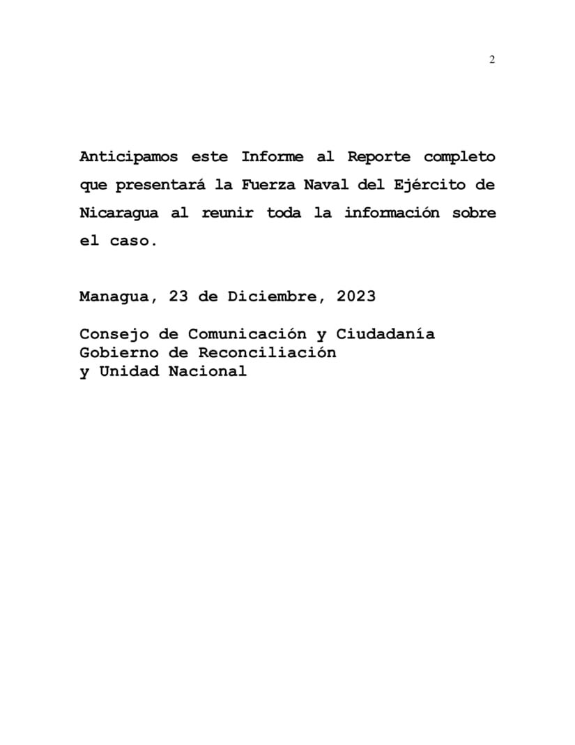 Anticipamos este Informe al Reporte completo que presentará la Fuerza Naval del Ejército de Nicaragua al reunir toda la información sobre el caso.