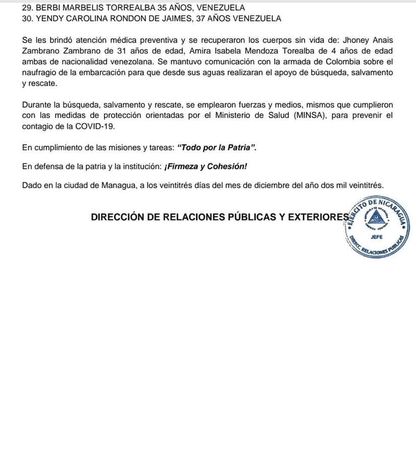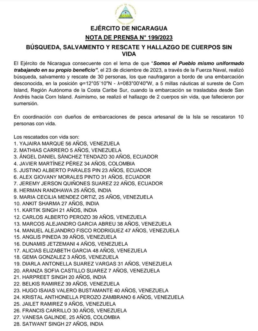El Ejército de Nicaragua consecuente con el lema de que “Somos el Pueblo mismo uniformado trabajando en su propio beneficio”, el 23 de diciembre de 2023, a través de la Fuerza Naval, realizó búsqueda, salvamento y rescate de 30 personas, los que naufragaron a bordo de una embarcación desconocida, en la posición φ=12°05´10"N - λ=083°00'40"W, a 5 millas náuticas al sureste de Corn Island, Región Autónoma de la Costa Caribe Sur, cuando la embarcación se trasladaba desde San Andrés hacia Corn Island. Asimismo, se realizó el hallazgo de 2 cuerpos sin vida, que fallecieron por sumersión.
