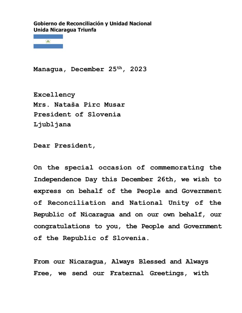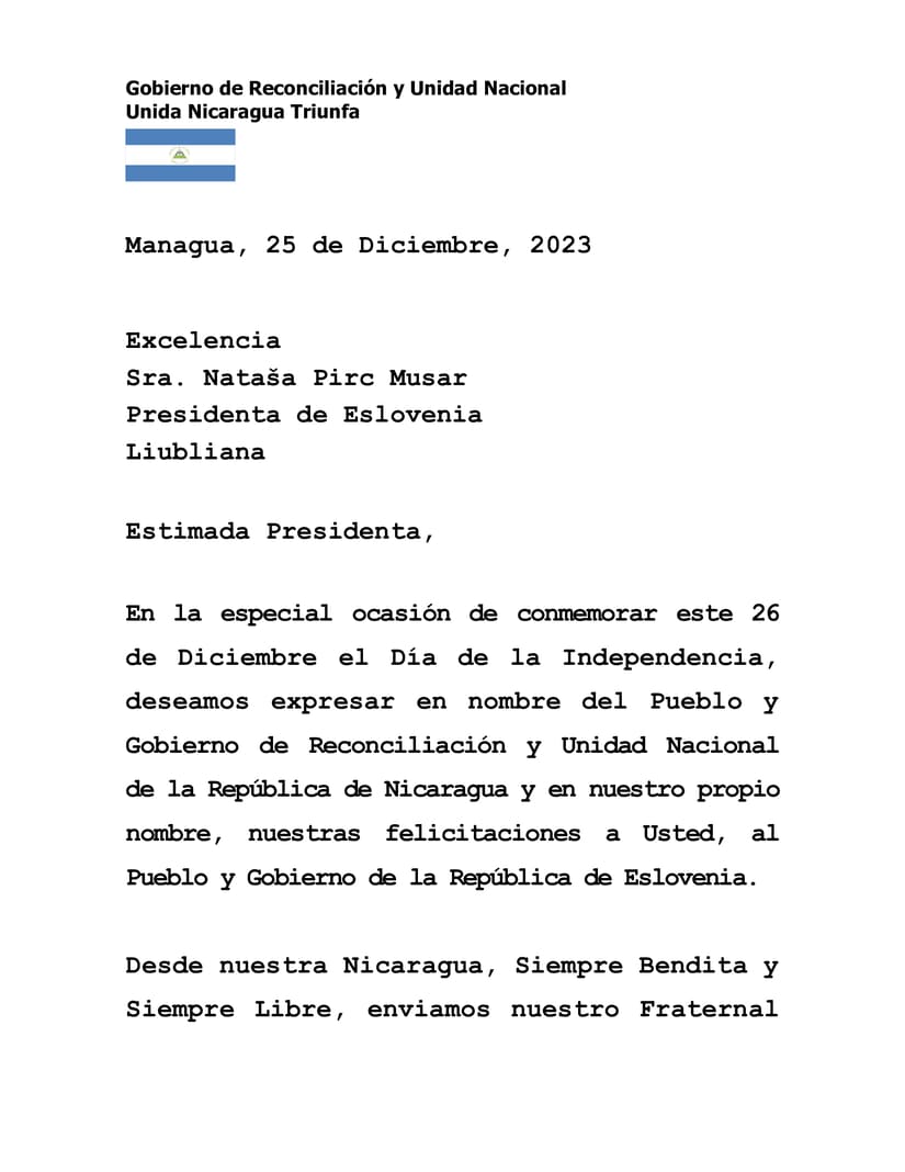 En la especial ocasión de conmemorar este 26 de Diciembre el Día de la Independencia, deseamos expresar en nombre del Pueblo y Gobierno de Reconciliación y Unidad Nacional de la República de Nicaragua y en nuestro propio nombre, nuestras felicitaciones a Usted, al Pueblo y Gobierno de la República de Eslovenia.