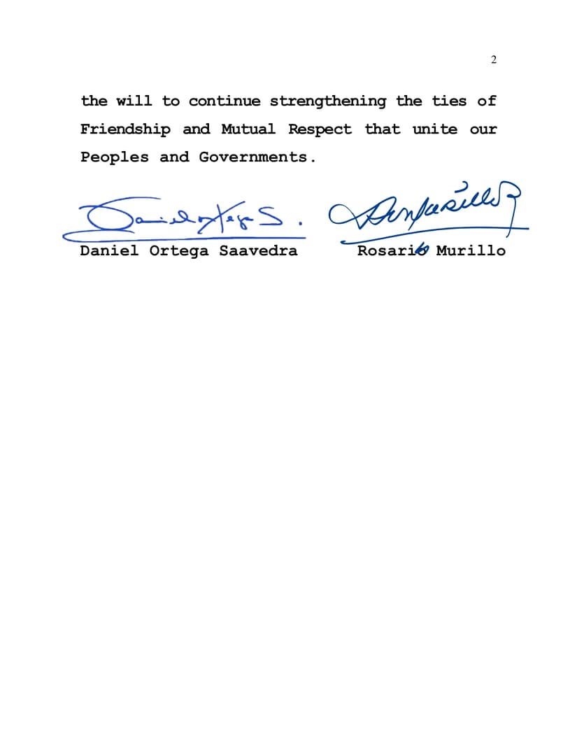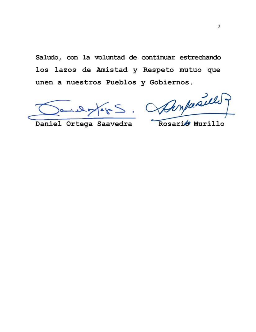 From our Nicaragua, Always Blessed and Always Free, we send our Fraternal Greetings, with the will to continue strengthening the ties of Friendship and Mutual Respect that unite our Peoples and Governments.
