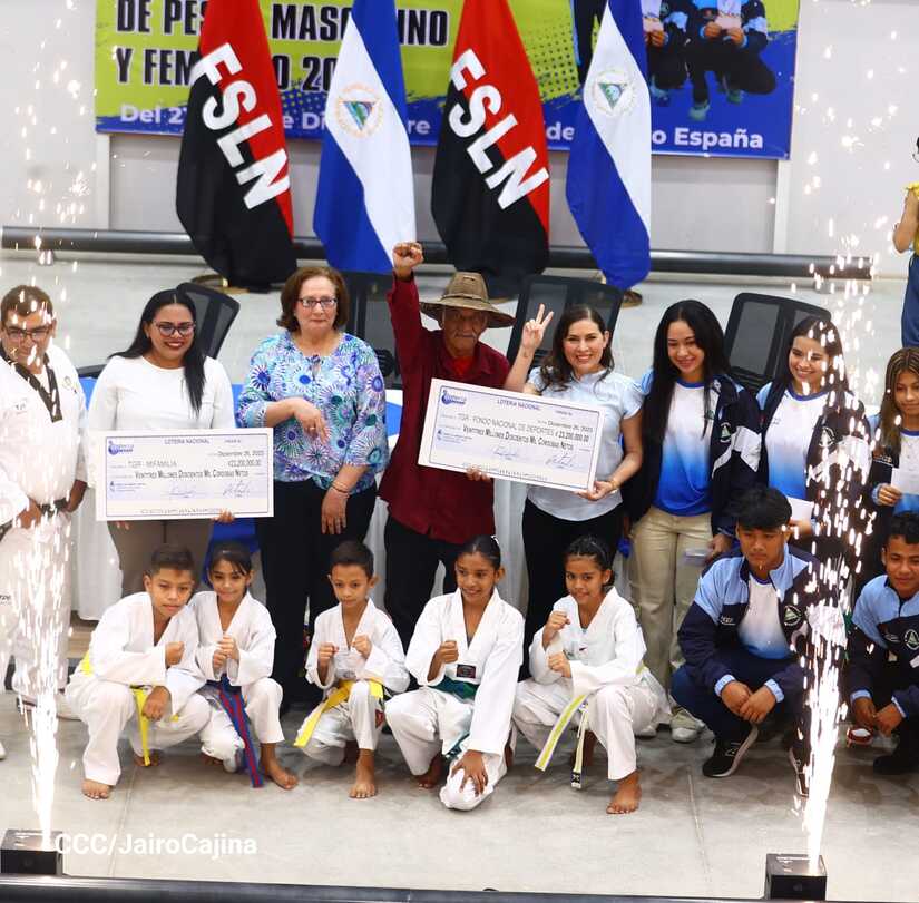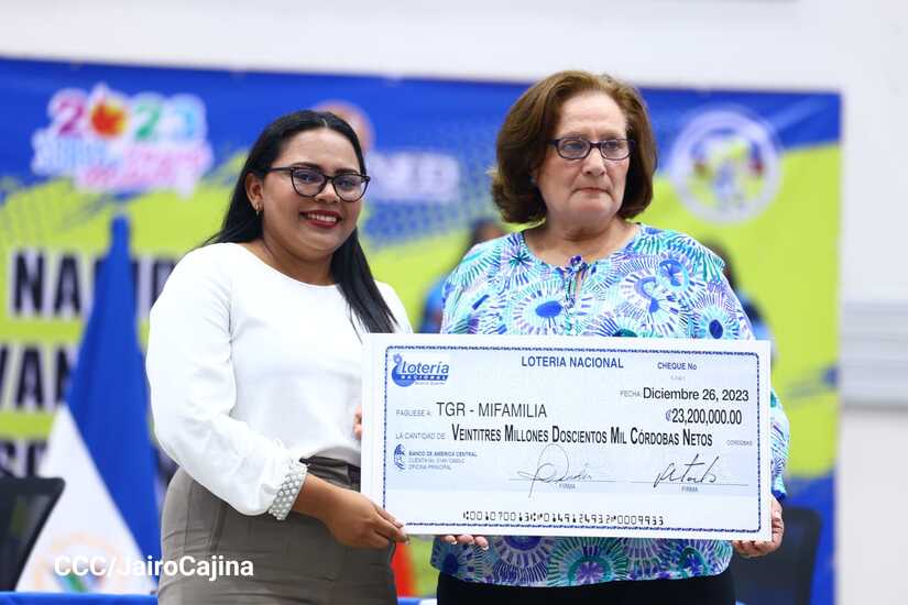 En el Polideportivo España, Lotería Nacional hizo una entrega extraordinaria de utilidades al Ministerio de la Familia, Niñez y Adolescencia (Mifan) y el Instituto Nicaragüense de Deportes (IND), que sumó la cantidad de 46 millones 400 mil córdobas, con la cual supera la meta en 2023.