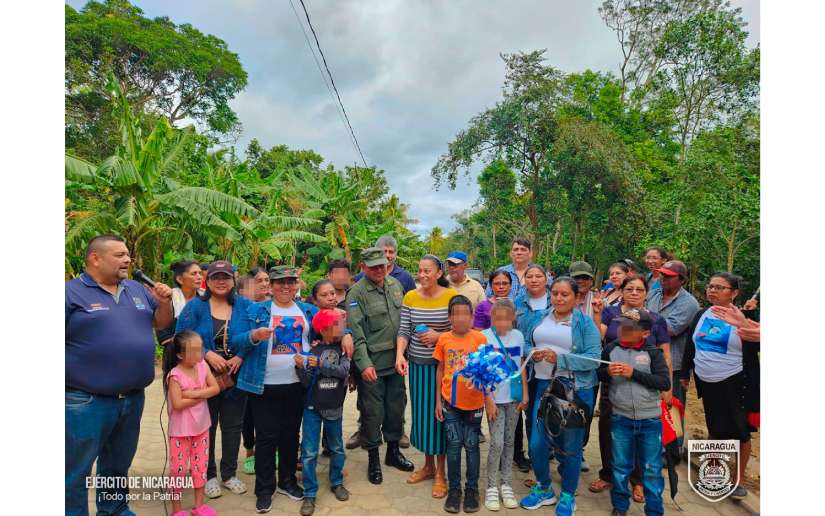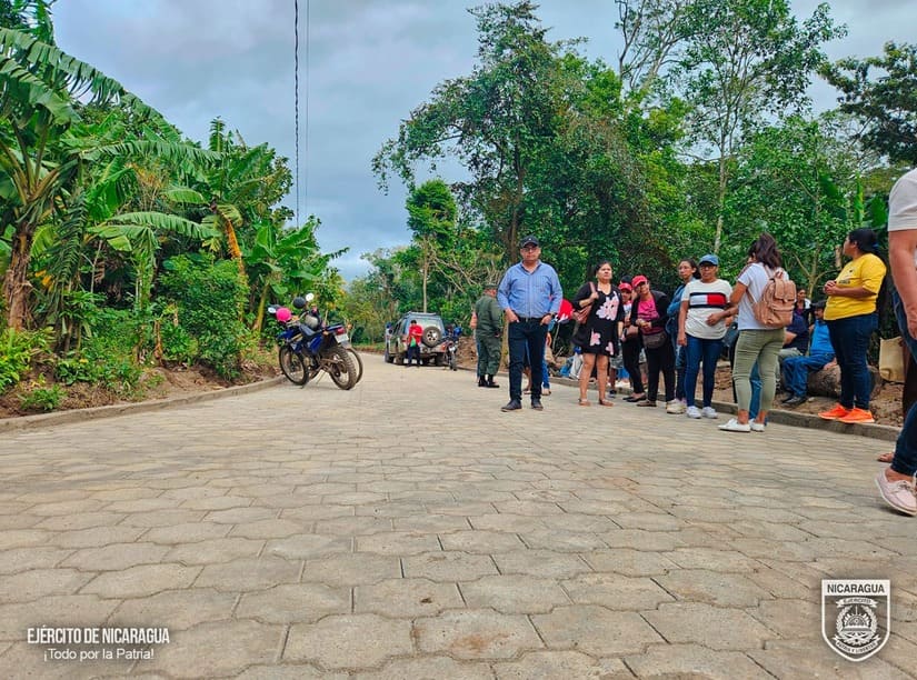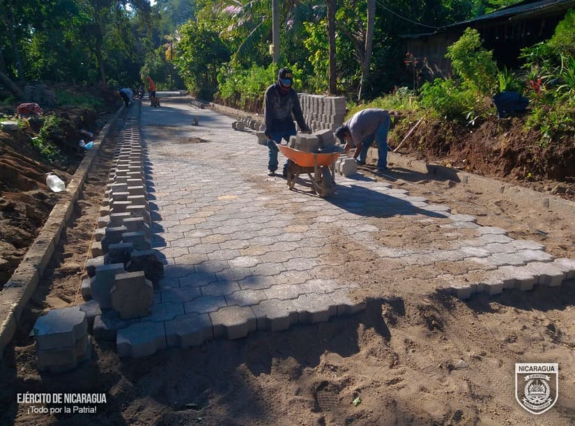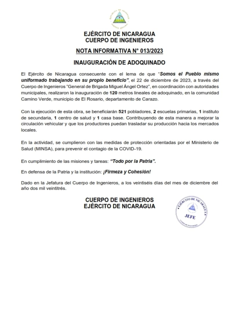 El Ejército de Nicaragua consecuente con el lema de que “Somos el Pueblo mismo uniformado trabajando en su propio beneficio”, el 22 de diciembre de 2023, a través del Cuerpo de Ingenieros “General de Brigada Miguel Ángel Ortez”, en coordinación con autoridades municipales, realizaron la inauguración de 120 metros lineales de adoquinado, en la comunidad Camino Verde, municipio de El Rosario, departamento de Carazo.