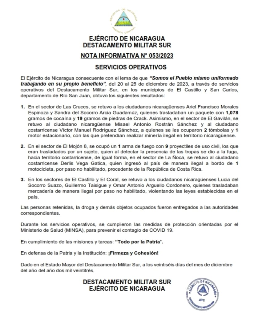 El Ejército de Nicaragua consecuente con el lema de que “Somos el Pueblo mismo uniformado trabajando en su propio beneficio”, del 20 al 25 de diciembre de 2023, a través de servicios operativos del Destacamento Militar Sur, en los municipios de El Castillo y San Carlos, departamento de Río San Juan, obtuvo los siguientes resultados: