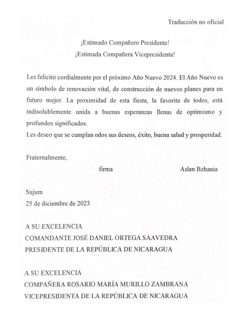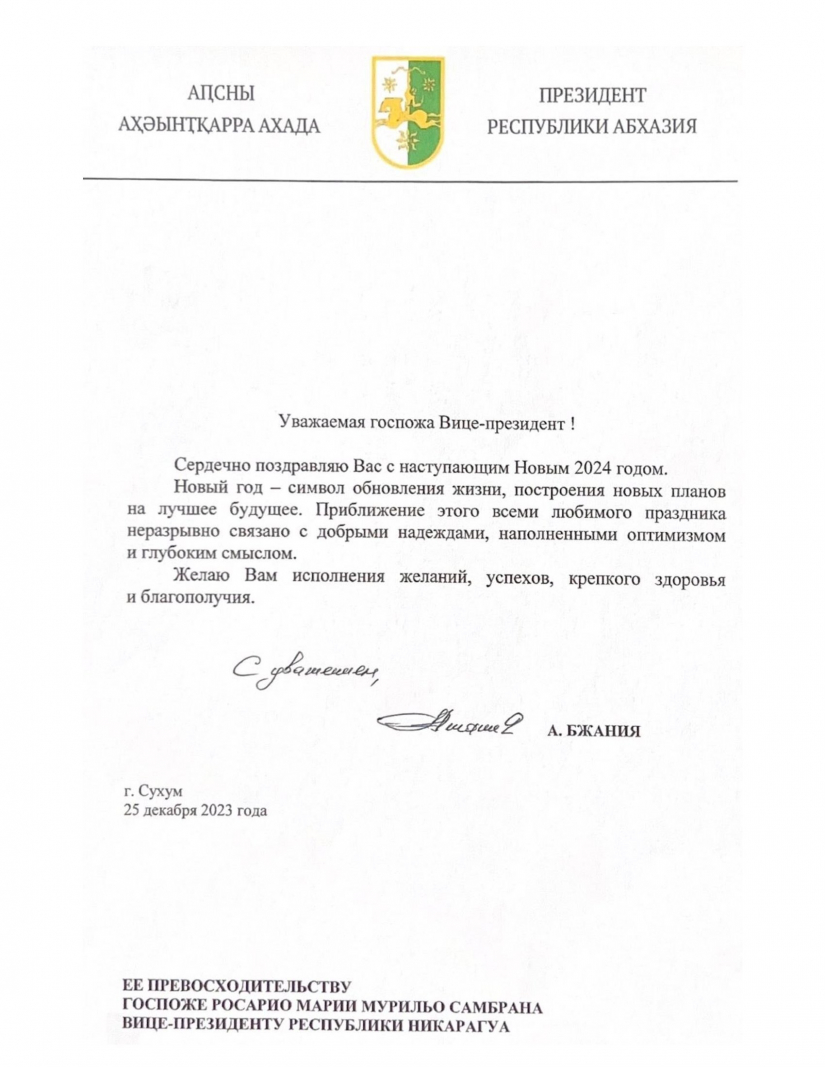 Recibimos y remitimos Mensaje de felicitaciones del Compañero Aslan Bzhnia, Presidente de la República de Abjasia, al Presidente-Comandante Daniel, y Compañera Rosario, al aproximarse la fiesta de Año Nuevo 2024.