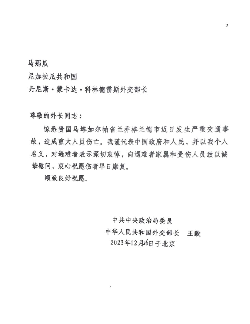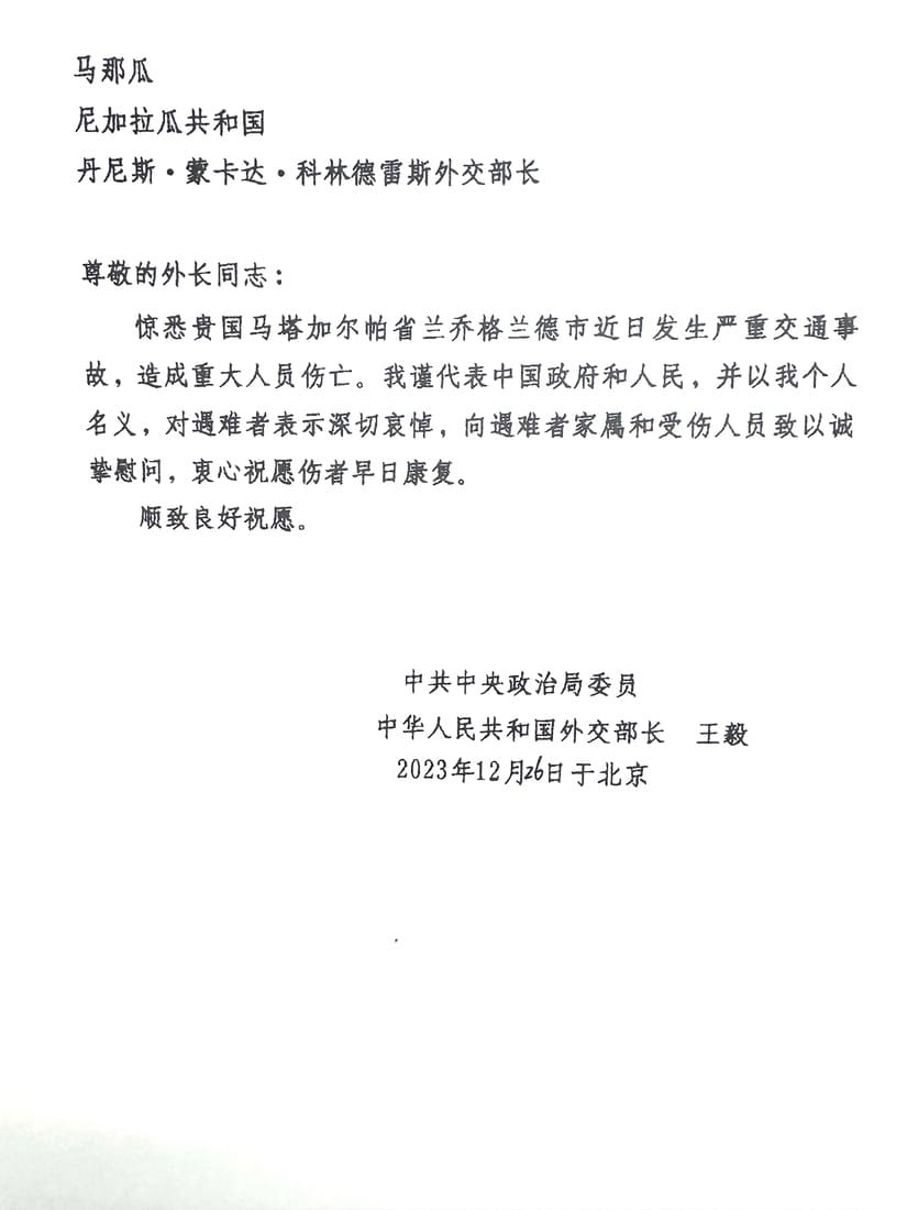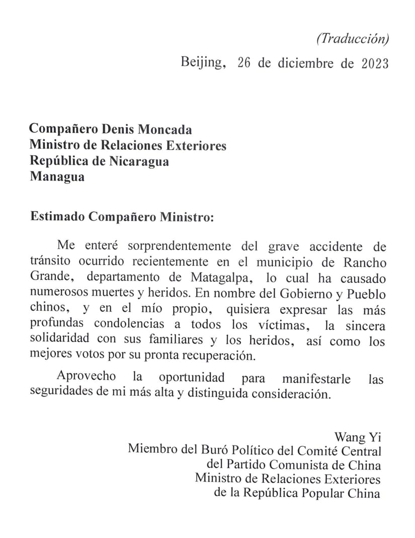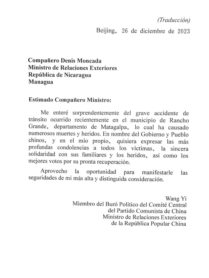 Mensaje de Solidaridad del Compañero Wang Yi, Canciller de la República Popular China, a nuestro Canciller, Compañero Denis Moncada Colindres, por el accidente de tránsito ocurrido recientemente en el Municipio de Rancho Grande, Departamento de Matagalpa.