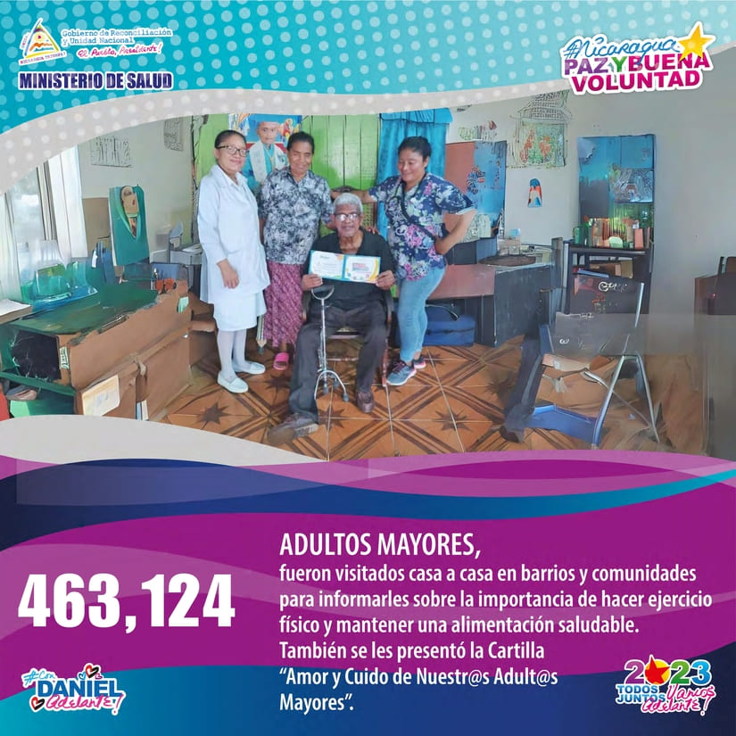 -463,124 Adult@s Mayores, fueron visitados casa a casa en barrios y comunidades para informarles sobre la importancia de hacer ejercicio físico y mantener una alimentación saludable. También se les presentó la Cartilla “Amor y Cuido de Nuestr@s Adult@s Mayores”.
