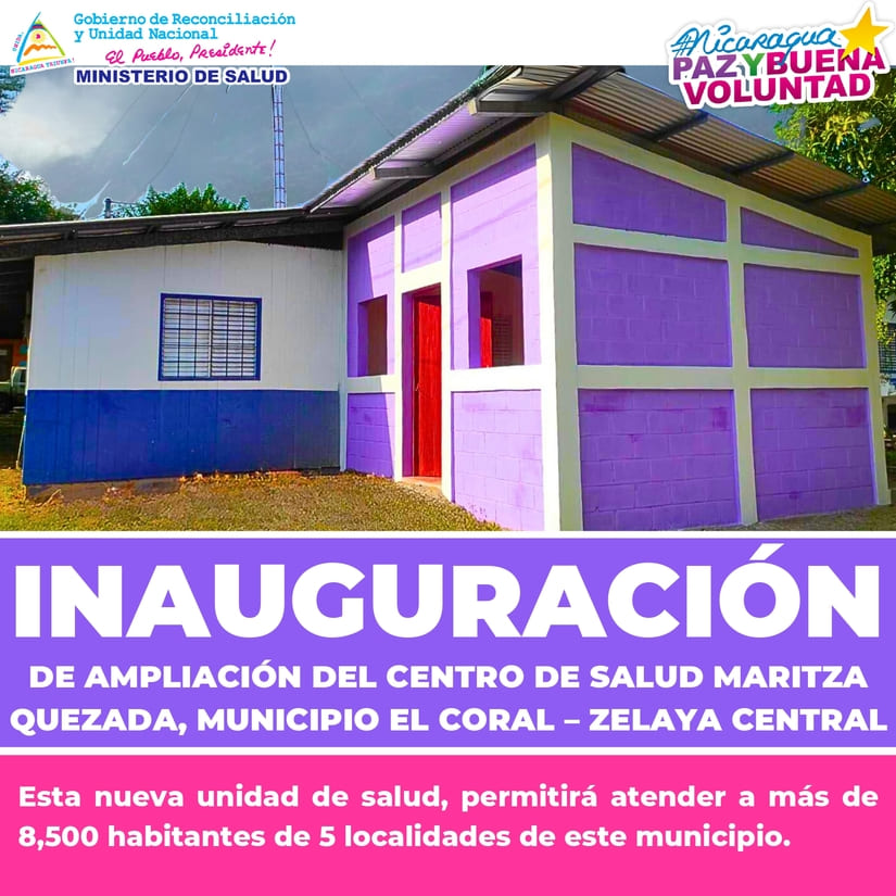 Mañana Viernes se realizará entrega de la ampliación del Centro de Salud Maritza Quezada, Municipio El Coral, Zelaya Central, para atender en mejores condiciones a casi 8,500 habitantes de 5 localidades de este municipio. (Inversión 362 mil córdobas).