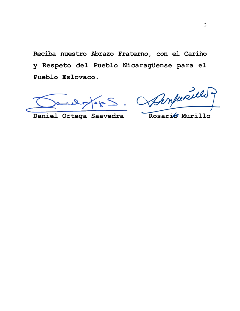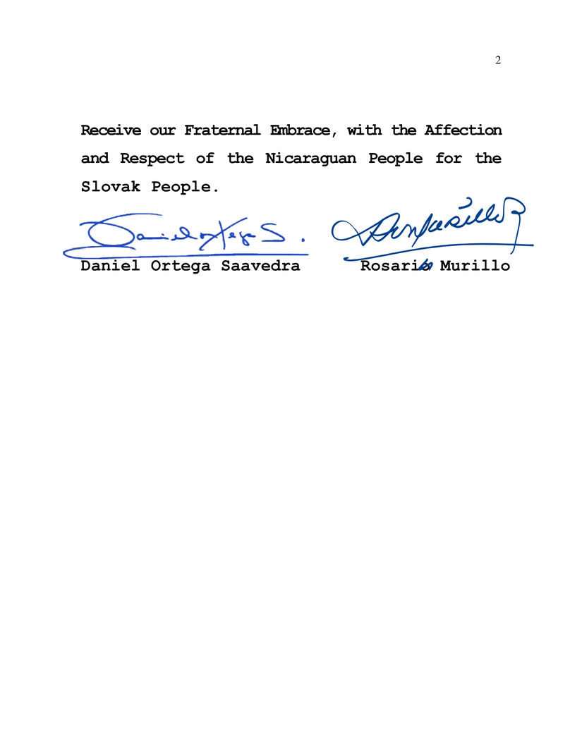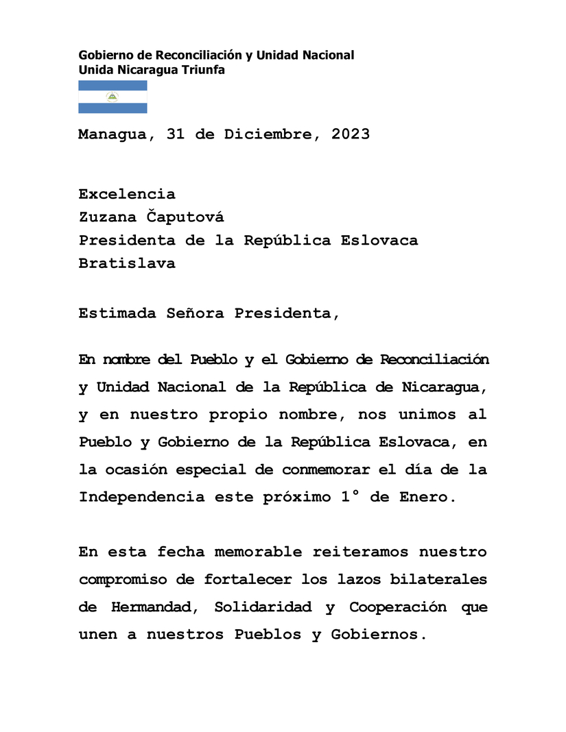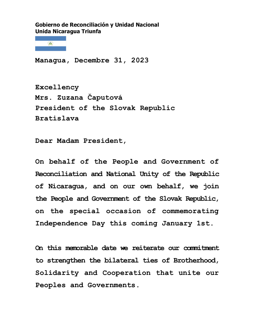 En nombre del Pueblo y el Gobierno de Reconciliación y Unidad Nacional de la República de Nicaragua, y en nuestro propio nombre, nos unimos al Pueblo y Gobierno de la República Eslovaca, en la ocasión especial de conmemorar el día de la Independencia este próximo 1° de Enero.