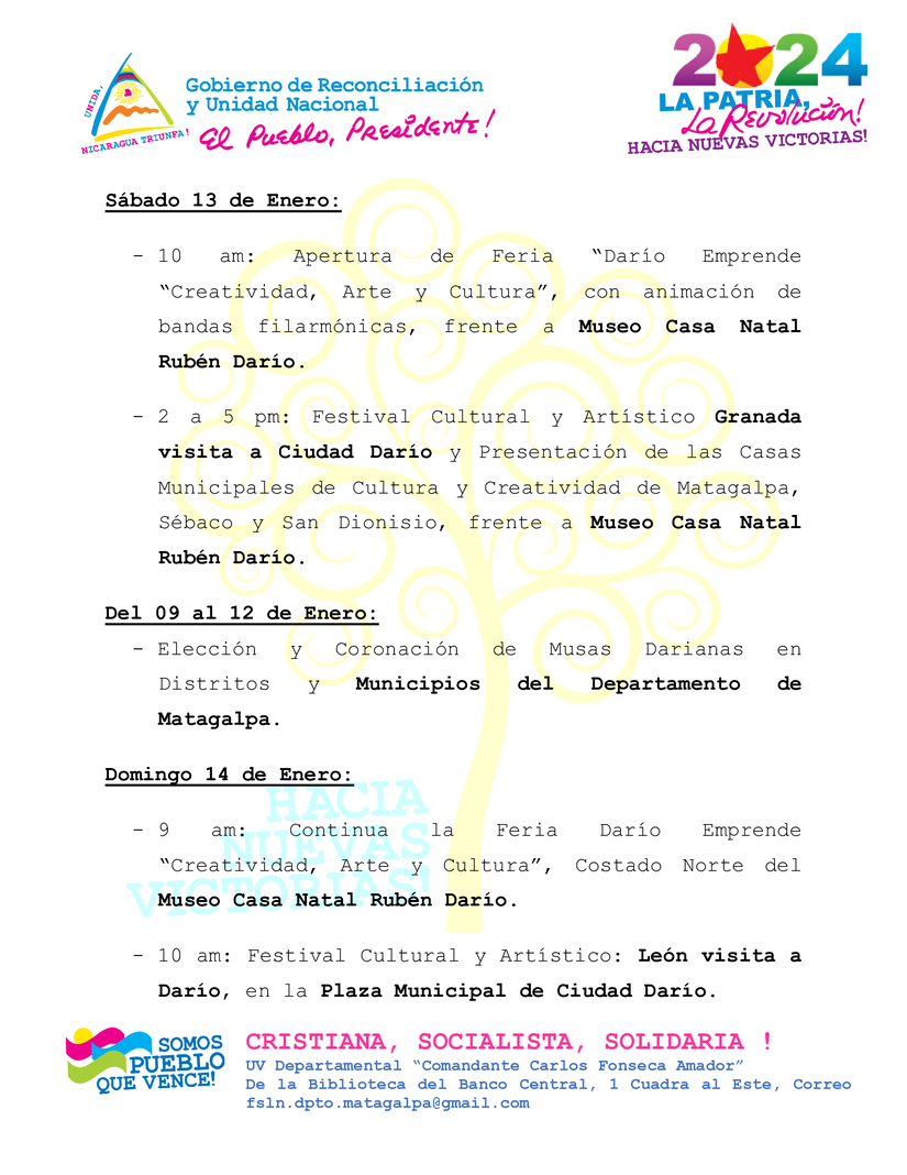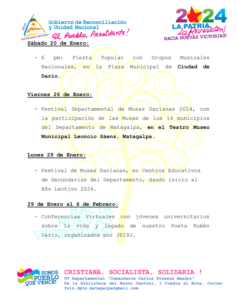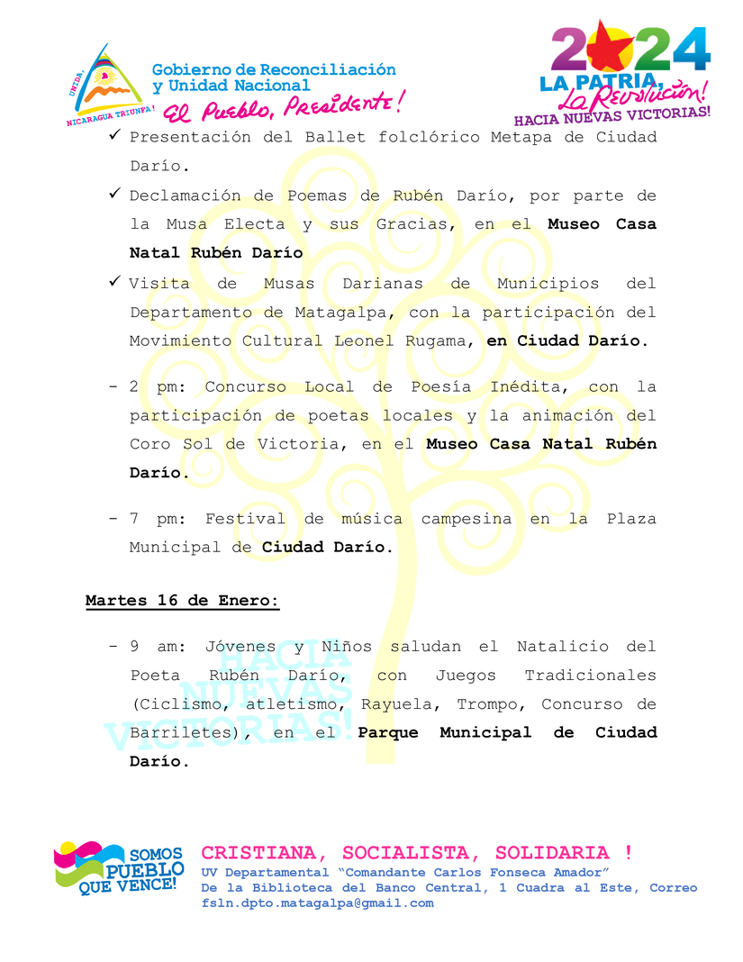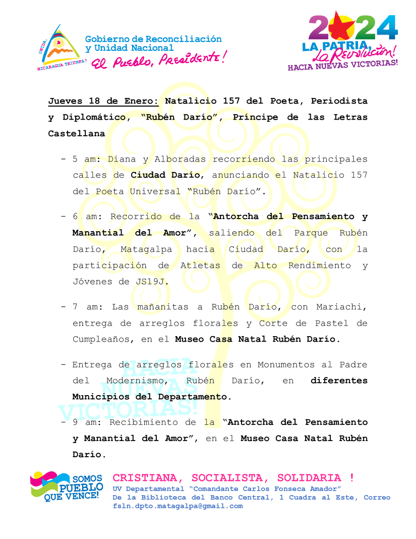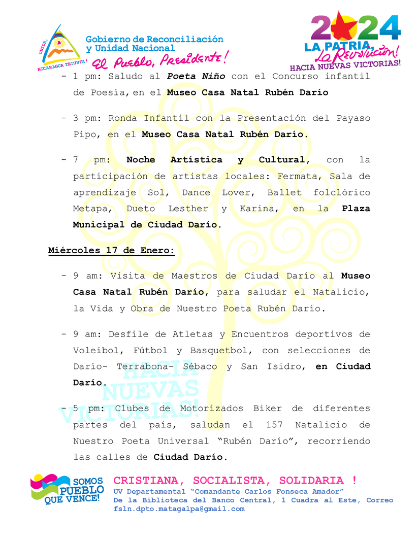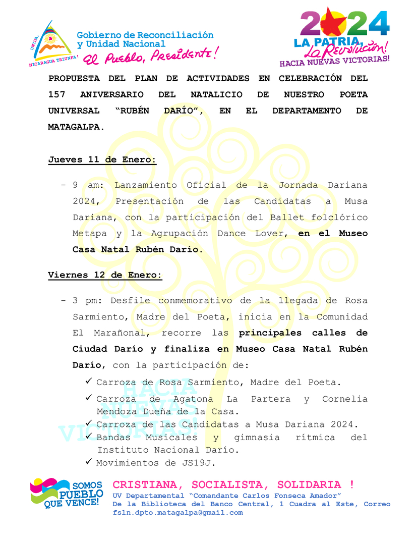 Propuesta del Plan de Actividades en celebración del 157 aniversario del Natalicio de nuestro poeta universal "Rubén Darío", en el departamento de Matagalpa.