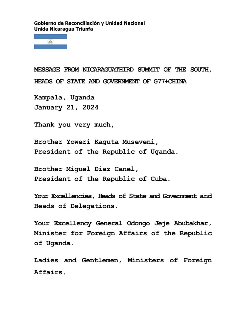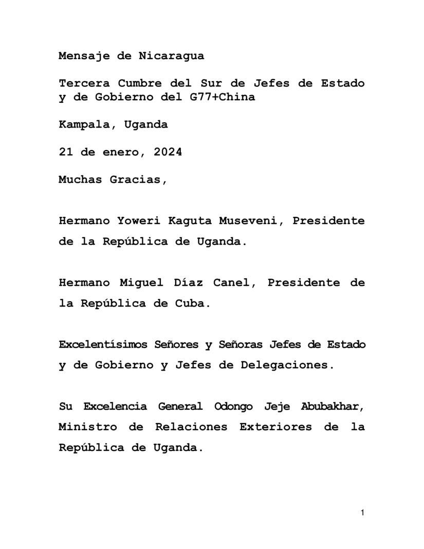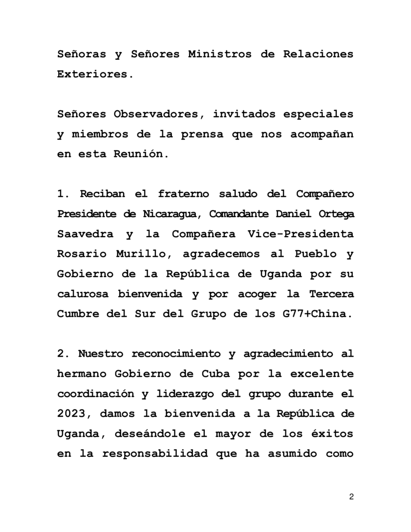 1. Reciban el fraterno saludo del Compañero Presidente de Nicaragua, Comandante Daniel Ortega Saavedra y la Compañera Vice-Presidenta Rosario Murillo, agradecemos al Pueblo y Gobierno de la República de Uganda por su calurosa bienvenida y por acoger la Tercera Cumbre del Sur del Grupo de los G77+China.