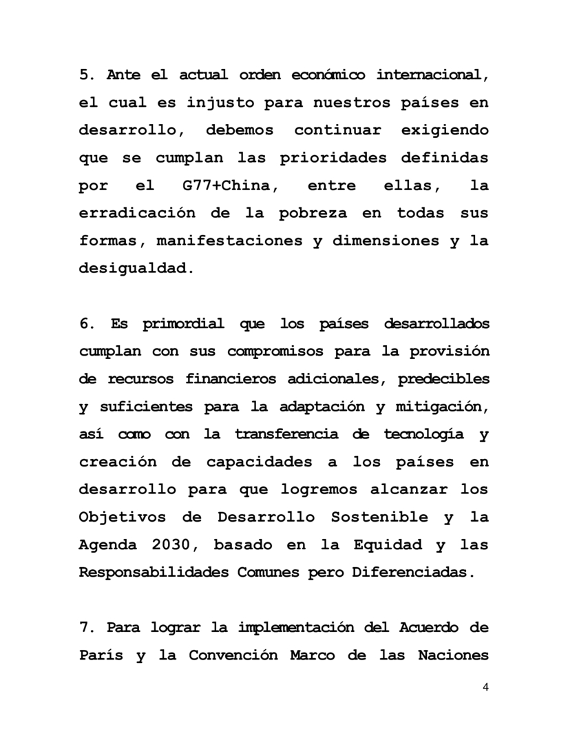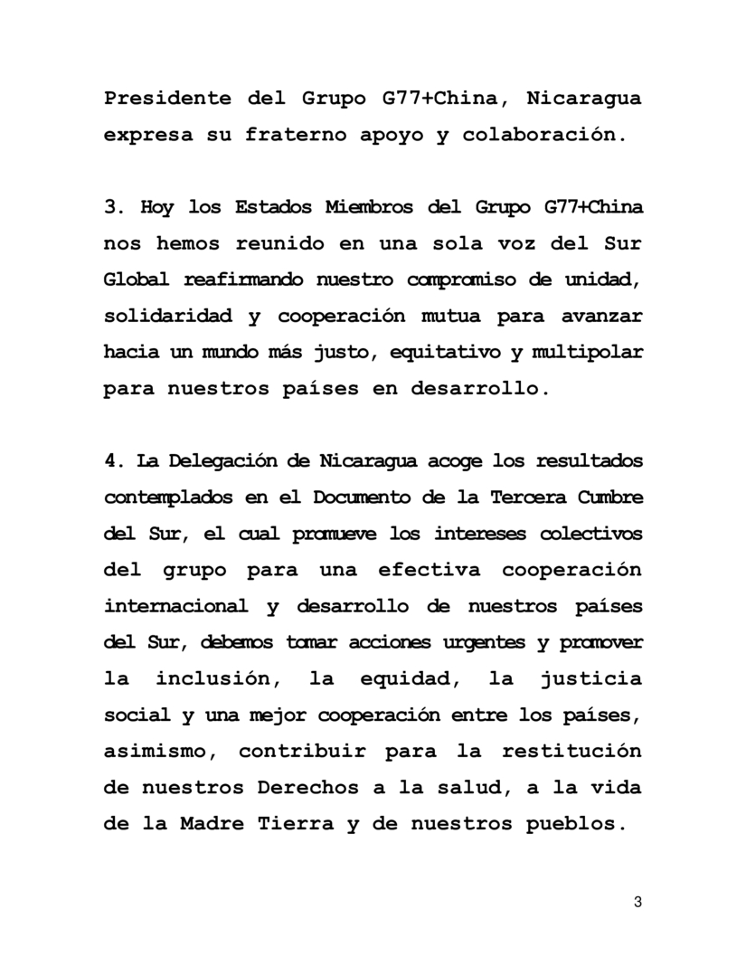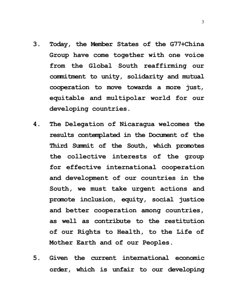 3. Hoy los Estados Miembros del Grupo G77+China nos hemos reunido en una sola voz del Sur Global reafirmando nuestro compromiso de unidad, solidaridad y cooperación mutua para avanzar hacia un mundo más justo, equitativo y multipolar para nuestros países en desarrollo.