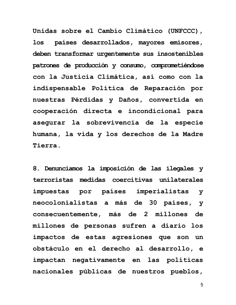 7. Para lograr la implementación del Acuerdo de París y la Convención Marco de las Naciones Unidas sobre el Cambio Climático (UNFCCC), los países desarrollados, mayores emisores, deben transformar urgentemente sus insostenibles patrones de producción y consumo, comprometiéndose con la Justicia Climática, así como con la indispensable Política de Reparación por nuestras Pérdidas y Daños, convertida en cooperación directa e incondicional para asegurar la sobrevivencia de la especie humana, la vida y los derechos de la Madre Tierra.