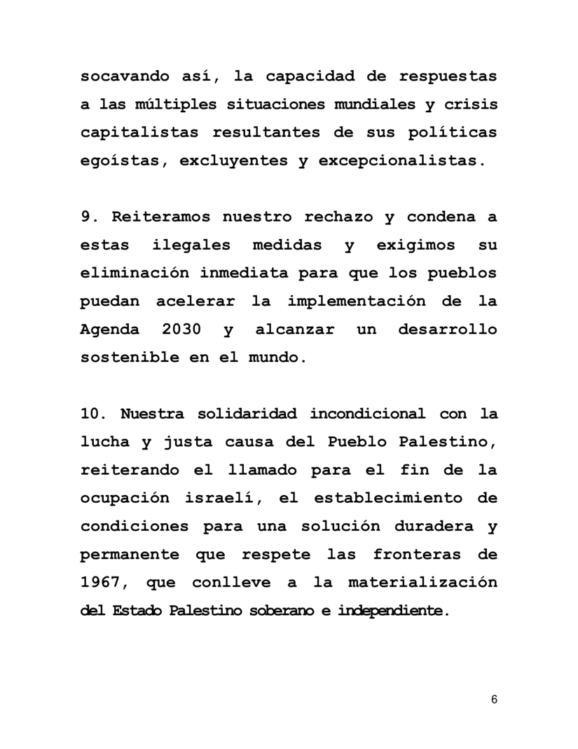 9. Reiteramos nuestro rechazo y condena a estas ilegales medidas y exigimos su eliminación inmediata para que los pueblos puedan acelerar la implementación de la Agenda 2030 y alcanzar un desarrollo sostenible en el mundo.