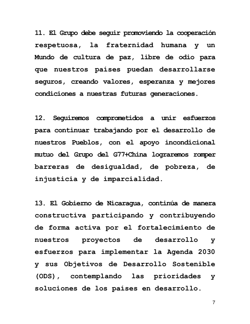 12. Seguiremos comprometidos a unir esfuerzos para continuar trabajando por el desarrollo de nuestros Pueblos, con el apoyo incondicional mutuo del Grupo del G77+China lograremos romper barreras de desigualdad, de pobreza, de injusticia y de imparcialidad.