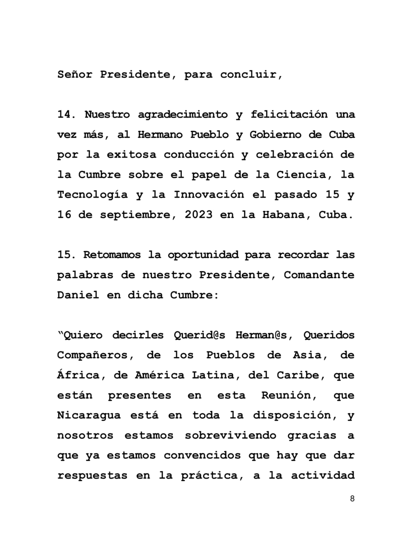 15. Retomamos la oportunidad para recordar las palabras de nuestro Presidente, Comandante Daniel en dicha Cumbre: